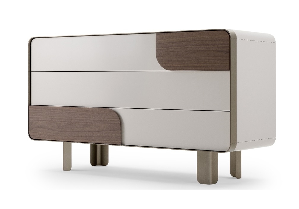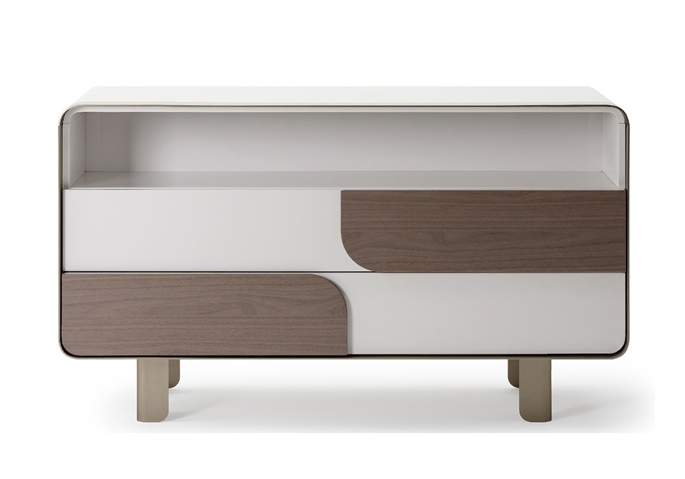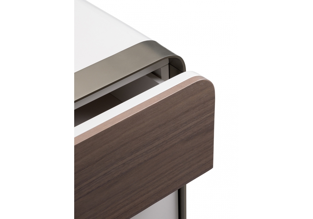 Soul firmata da Giuseppe Viganò per Turri è una cassettiera con struttura in MDF e pannelli di particelle di legno in finitura laccata lucida con dettagli decorativi in legno o marmo. Parti metalliche in finitura opaca. Disponibile nella versione con tre cassetti o due cassetti e un vano a giorno.