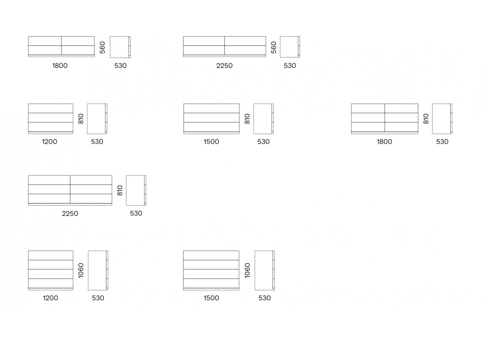 | Dimensioni | 180 x 53 x H 56 cm; 225 x 53 x H 56 cm; 120 x 53 x H 81 cm; 150 x 53 x H 81 cm; 180 x 53 x H 81 cm; 225 x 53 x H 81 cm; 120 x 53 x H 106 cm; 150 x 53 x H 106 cm. |