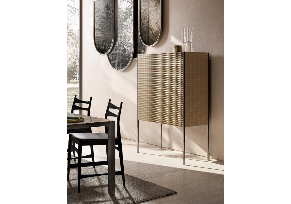 Spin firmato da Alessio Bassan & Silvano Pierdonà per Capodopera è un mobile contenitore alto con fianchi esterni e frontali in alveolare di alluminio rivestito in MDF. Le gambe sono in metallo nichel nero e sono dotate di piedini regolatori godronati. Le ante sono battenti, ed è possibile scegliere il modello con un vano internio e due ripiani spostabili in vetro grigio o due cassetti interni e due ripiani in vetro.