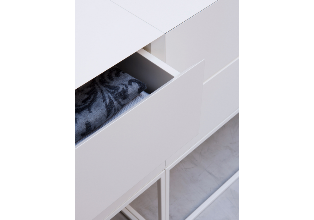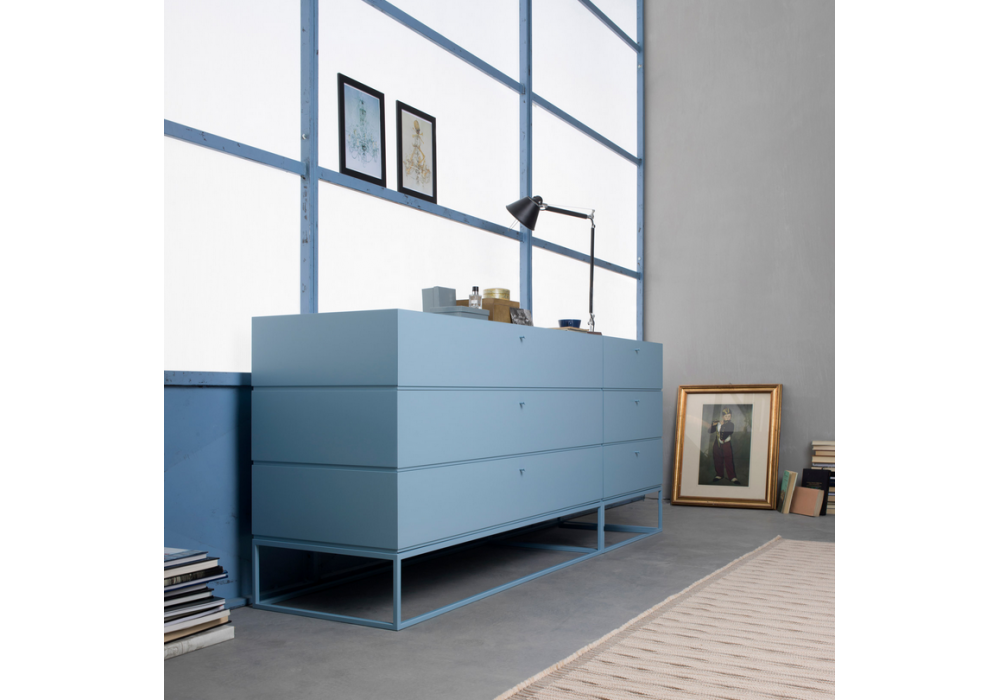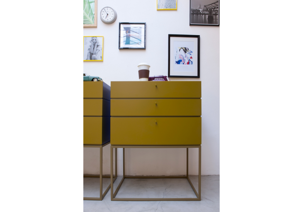 Box firmata da Manuela Pelizzon e Silvano Pierdonà per Capodopera è una cassettiera componibile con struttura in MDF laccato opaco e base in metallo in diverse finiture.