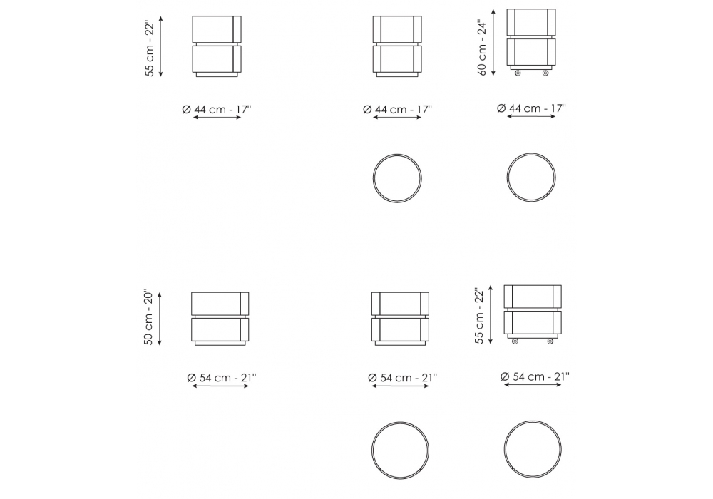 | Dimensioni | • Ø 44 x H 55/60 cm; • Ø 54 x H 50/55 cm |
