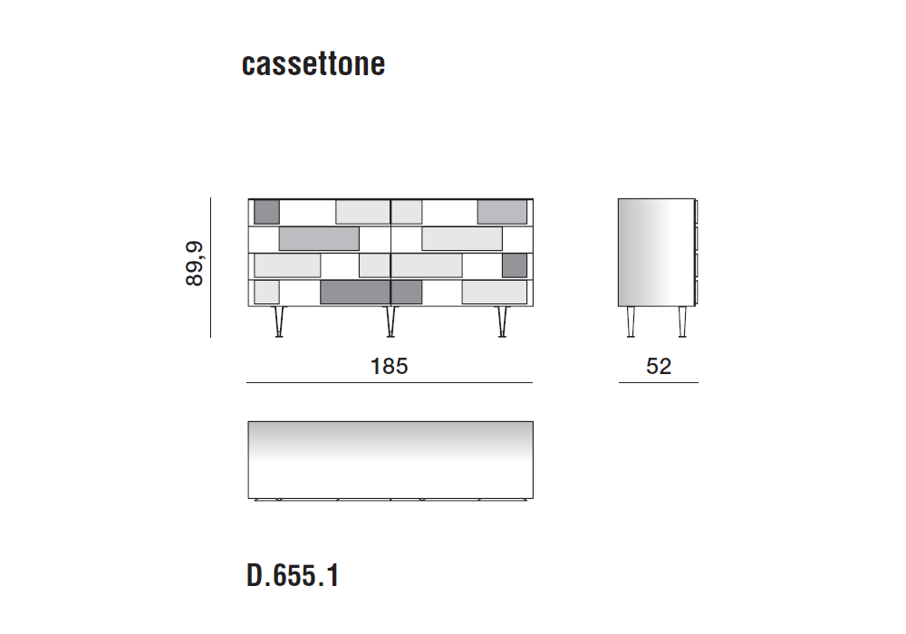 D.655.1 firmata da Gio Ponti per Molteni&C è una cassettiera caratterizzata dai frontali dei cassetti verniciati a mano in colore bianco con maniglie applicate di varie essenze (olmo, noce nazionale, mogano e palissandro). La struttura in essenza di olmo è sostenuta da piedi in ottone satinato.