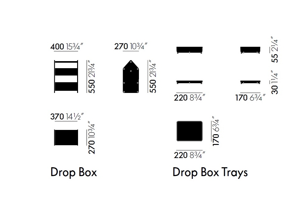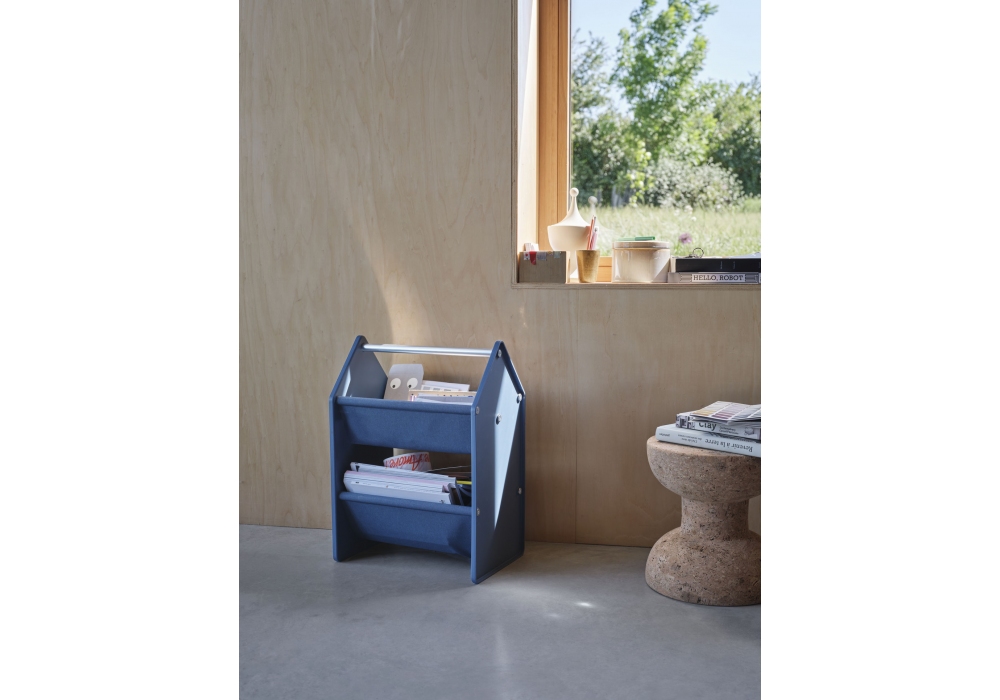 Drop Box firmato da Konstantin Grcic per Vitra è un portaoggetti realizzato in polipropilene riciclato, riciclabile a sua volta al 100%, tubi in alluminio e tessuto in poliestere.