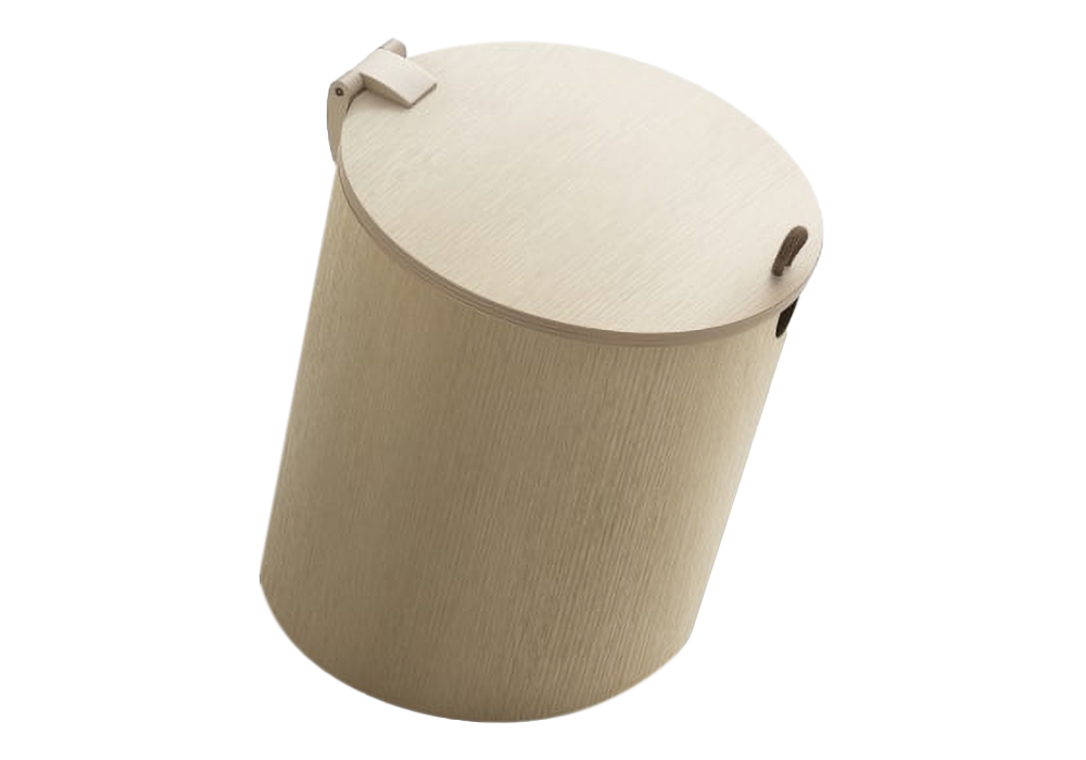 Midi Basket firmato da Benedini Associati per Agape è un contenitore da terra o da perete realizzato in multistrato curvato di betulla con rivestimento in rovere naturale, bruno, scuro, in legno precomposto con finitura teak oppure verniciato grigio o bianco. Completo di coperchio.