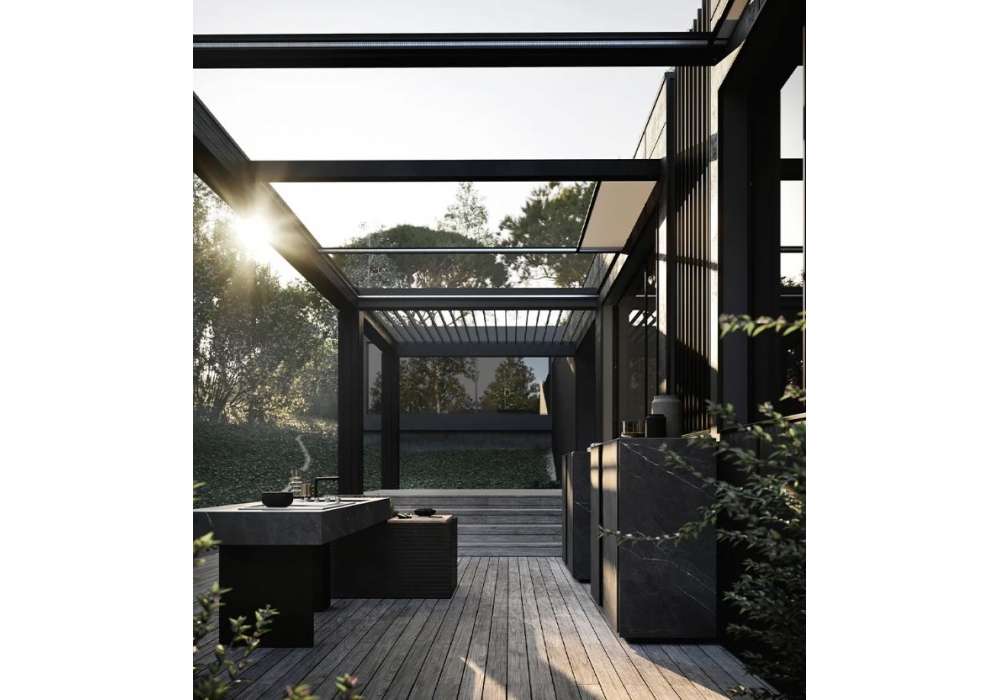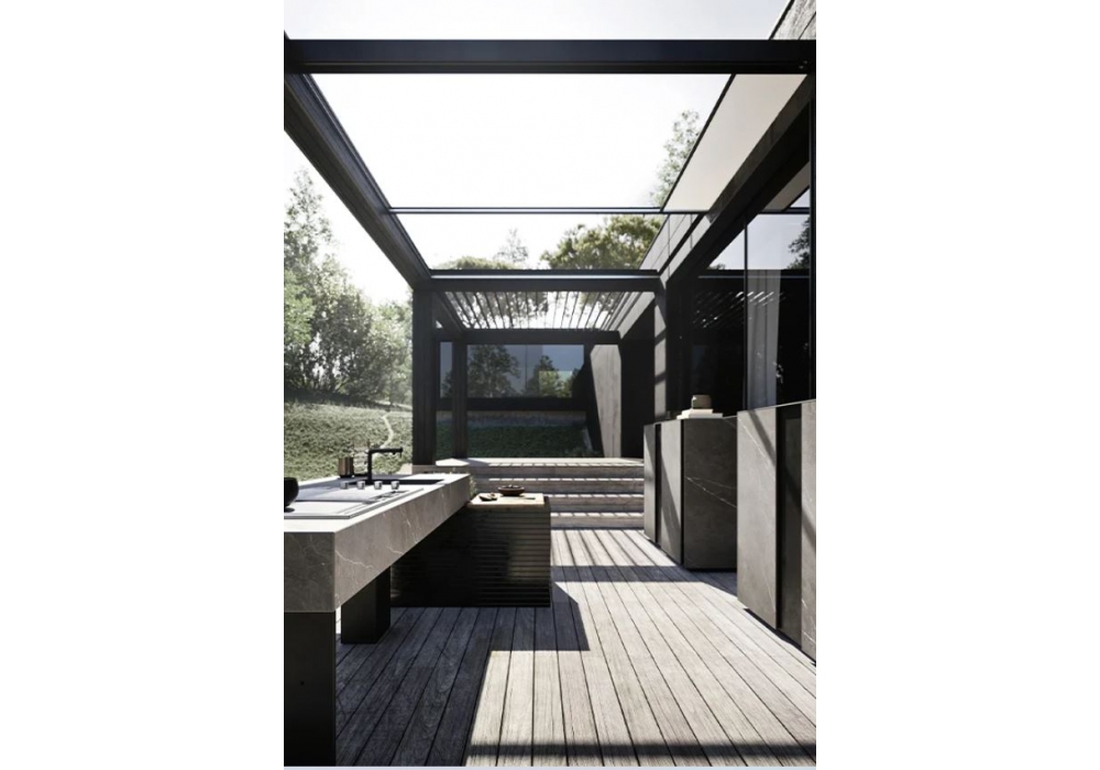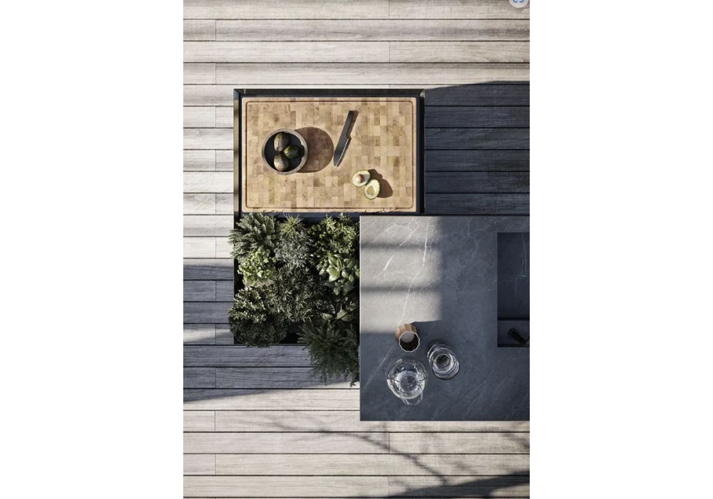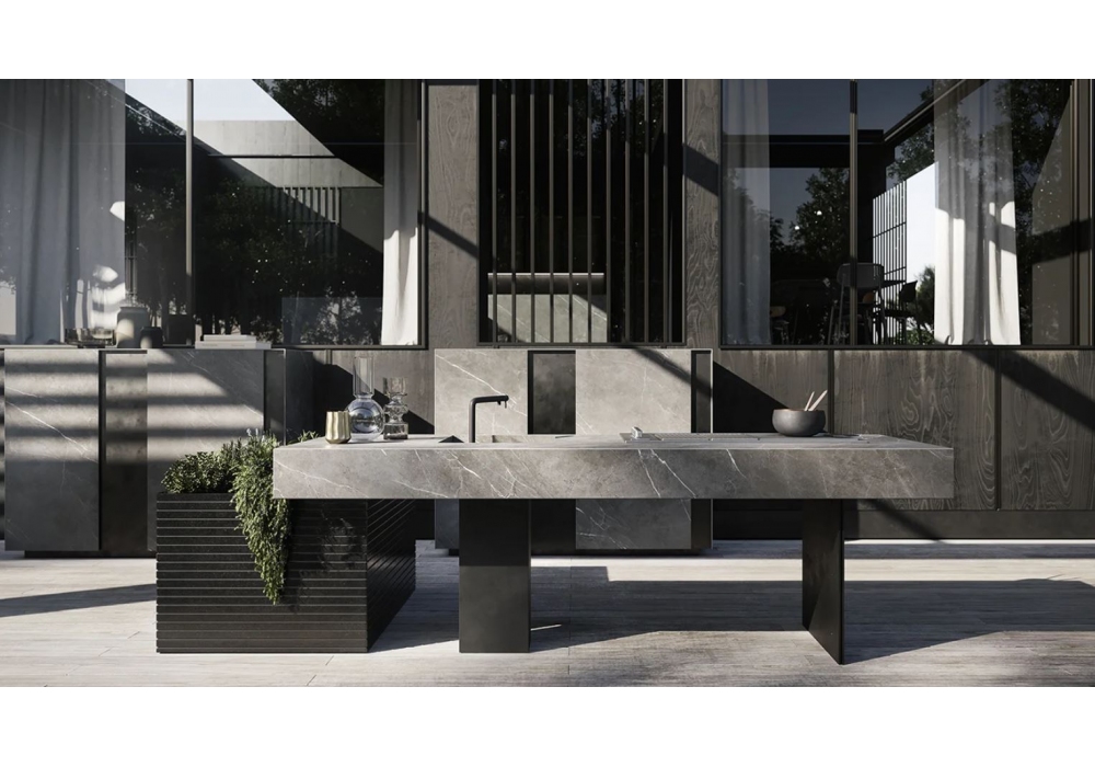 Project 05 firmato e prodotto da Modulnova è un sistema cucina composto da un piano in appoggio Mediterraneo in pietra Graphite Raw con vasca integrata e piano cottura in acciaio inox AISI 316, con struttura in acciaio finitura Epossidico Nero. L'isola Block è in granito Nero Assoluto, finitura Millerighe, mentre la madia Sipario è con ante battenti in gres Graphite Raw e parti verticali fisse in metallo Black Dust. Ogni elemento di questo sistema può essere realizzato in diversi materiali e finiture, contatta il nostro Customer Service per configurarlo come preferisci.