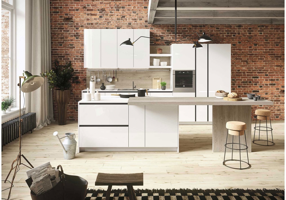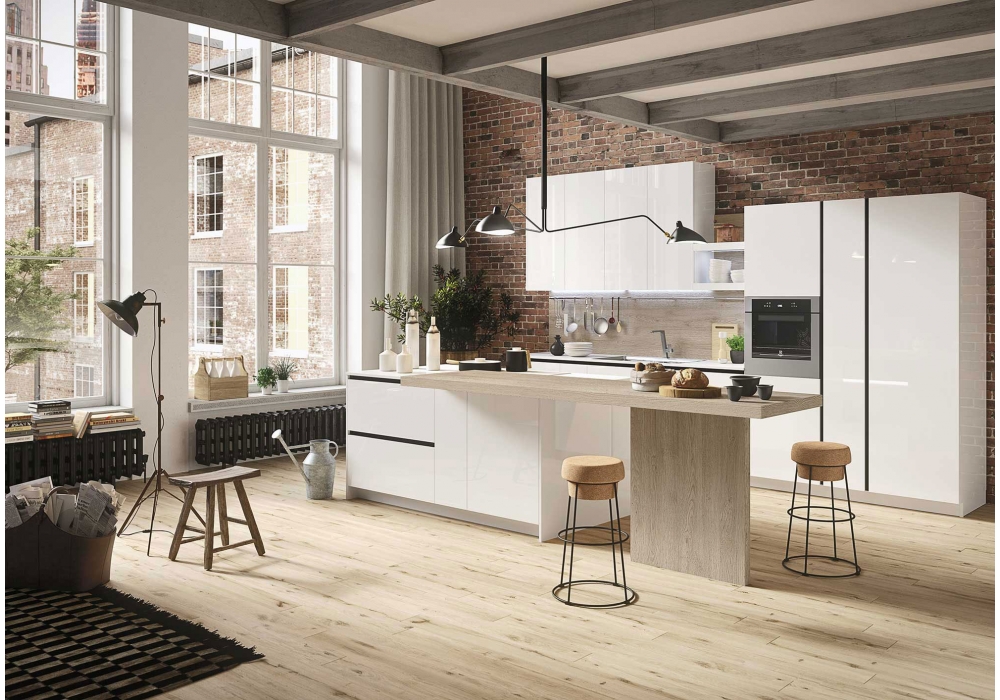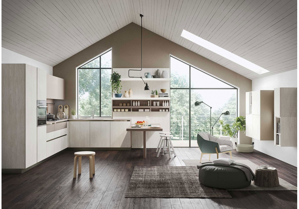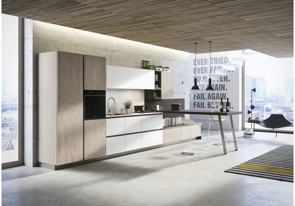 La cucina First di Snaidero, è una proposta di design economica adatta ad un pubblico giovanile soprattutto nel gusto. Ante massellate ABS e piani truciolare per ambienti umidi rivestito con laminato HPL antigraffio o in quarzo.