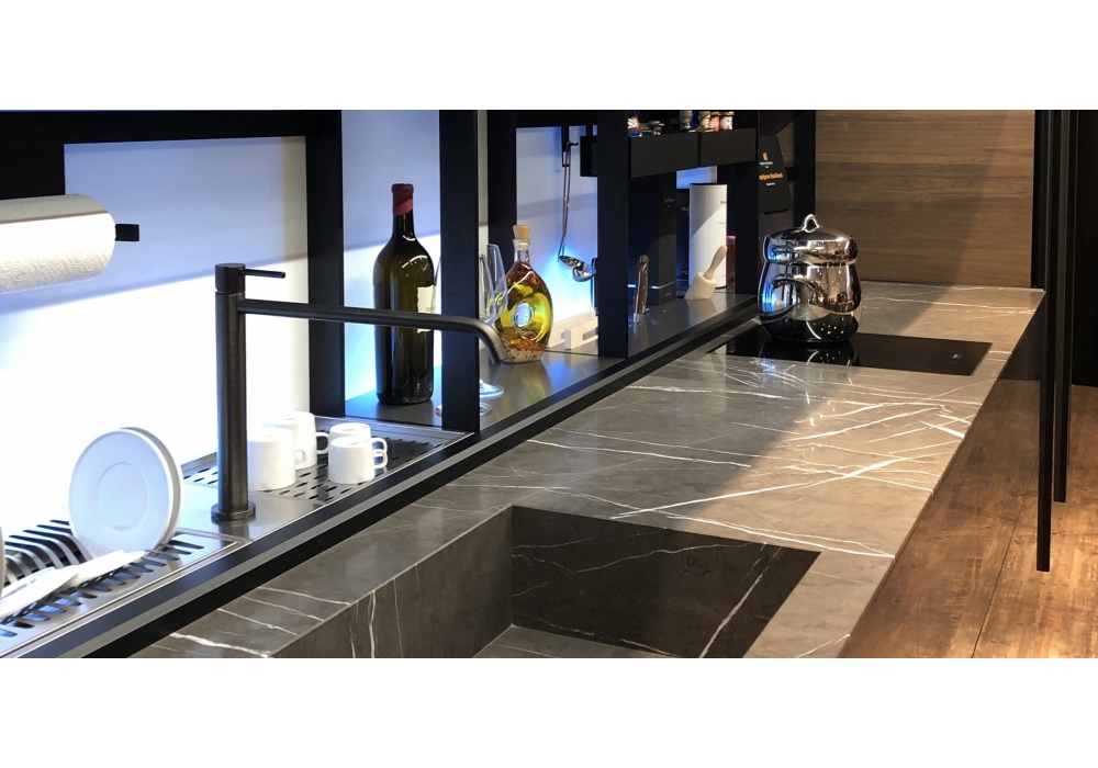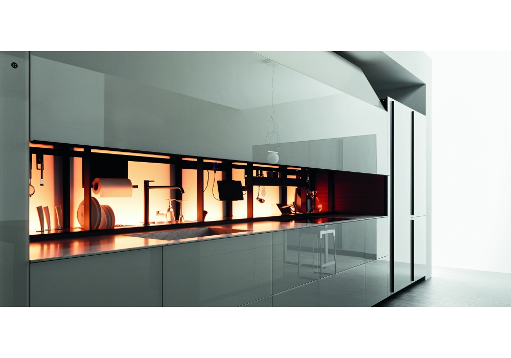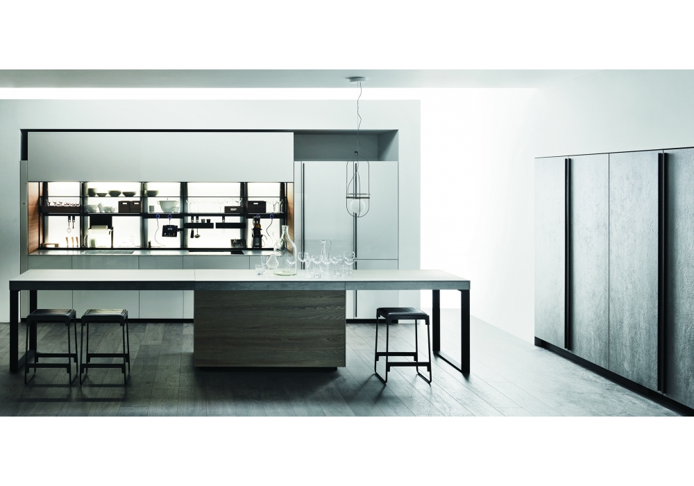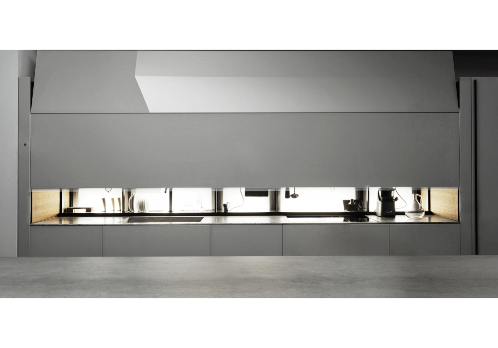 Logica Celata firmata da Gabriele Centazzo per Valcucine è una cucina orientata verso una progettazione poliedrica, su misura di chi la vive, costruita con bordi inclinati e micro-rigirati, per agevolare l'uso senza maniglie, restituendo praticità e pulizia estetica. I piani posso essere in vetro, laminato, pietra o acciaio. Ante in melaminico, MDF, angel skin o vetro.