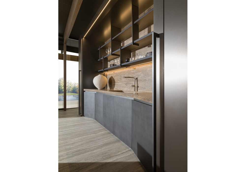 Tivalì 2.0 firmata da Yabu Pushelberg per Molteni&C è una cucina integrata per tutti gli spazi, si evolve con l’introduzione della nuova maniglia ergonomica in legno massello Post e l’allineamento alle colonne Operative 2.0. Il concetto che ha guidato la progettazione è stato quello di disporre la cucina in uno spazio utile interno tra i 2,4 e i 3 metri. Si presenta come un grande mobile chiuso che a prima vista non rivela il contenuto. Composta da due grandi ante scorrevoli a pacchetto che, grazie a sofisticati meccanismi, rientrano affiancandosi nella sagoma del contenitore. Le ante in tamburato nido d’ape in alluminio sono configurabili nelle diverse finiture di gamma.