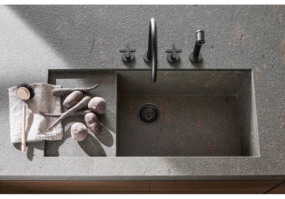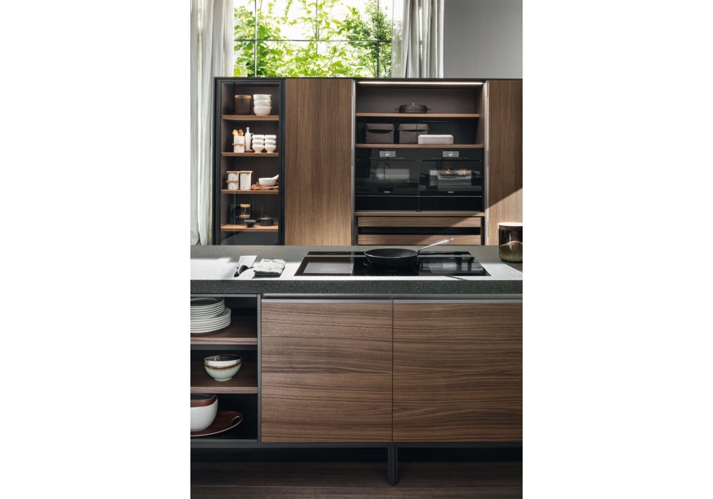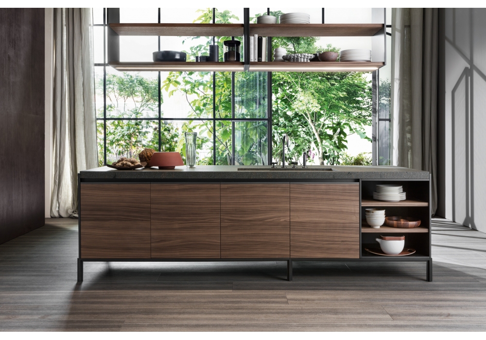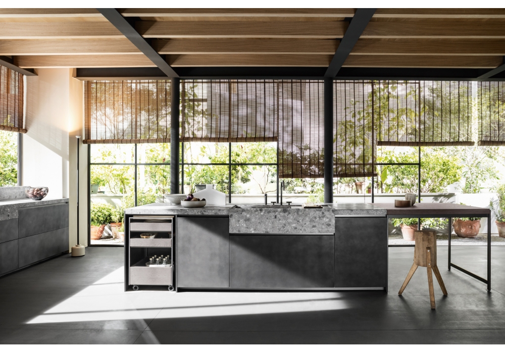VVD firmata da Vincent Van Duysen per Molteni&C è una cucina senza maniglia, che si basa sul contrasto tra gli spessori di fianchi e terminali e gli spessori forti dei piani di lavoro, che si integrano, interrompendo la linearità del piano, con lavelli in appoggio in pietra. Completano il progetto ampi vassoi estraibili, cassetti a giorno e carrelli integrabili nei sottopiani. L’innovazione si esprime con dettagli tecnologici quali la barra a LED integrata, il profilo in alluminio che disegna in modo discreto la maniglia dell’anta migliorandone la presa e l’innovativa cerniera pivot che permette alle ante un’apertura a 180°, rendendo più fruibile lo spazio interno.