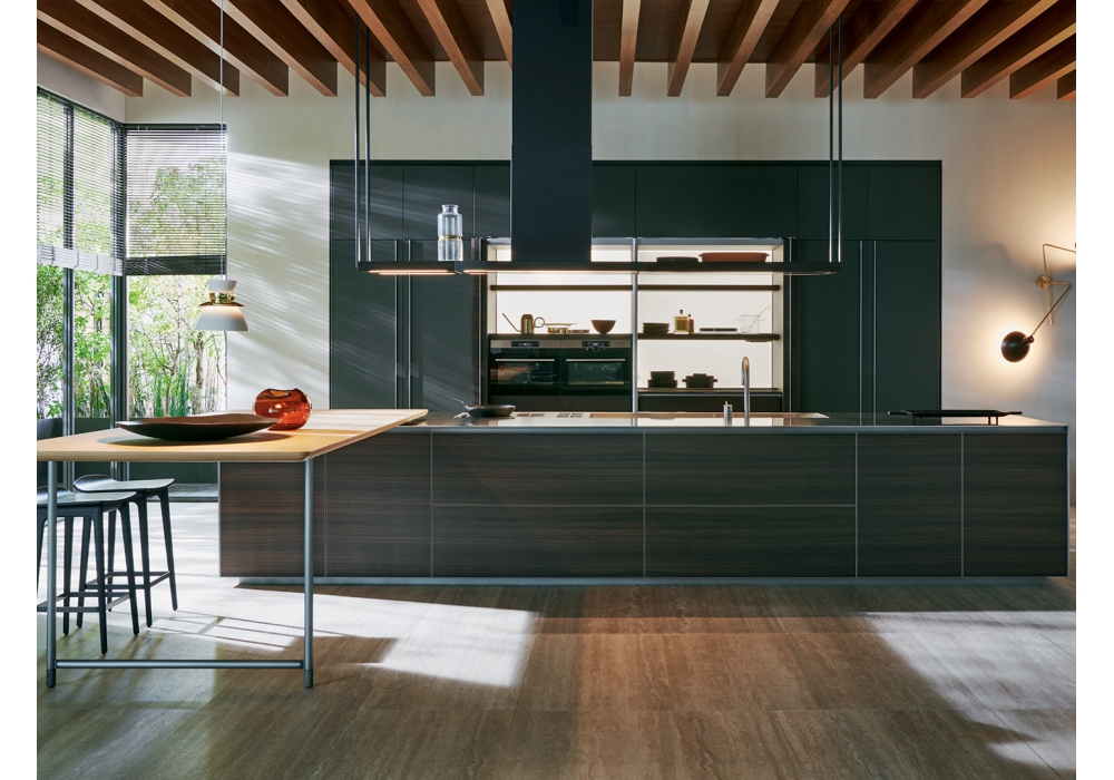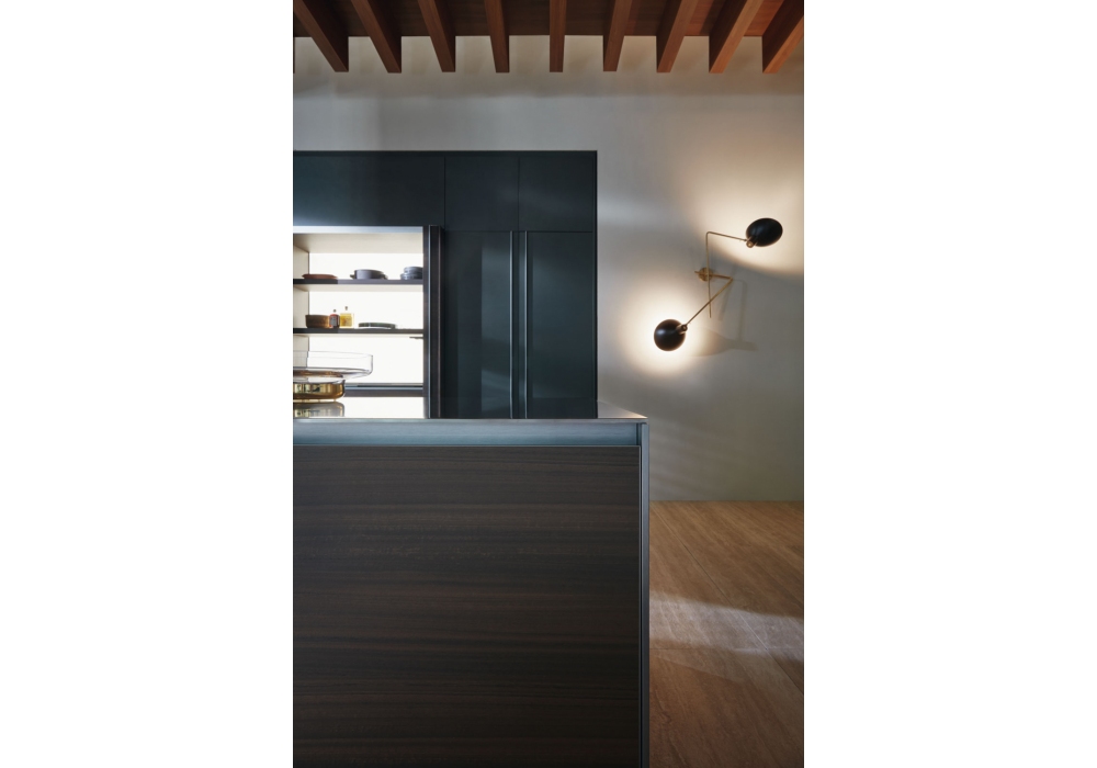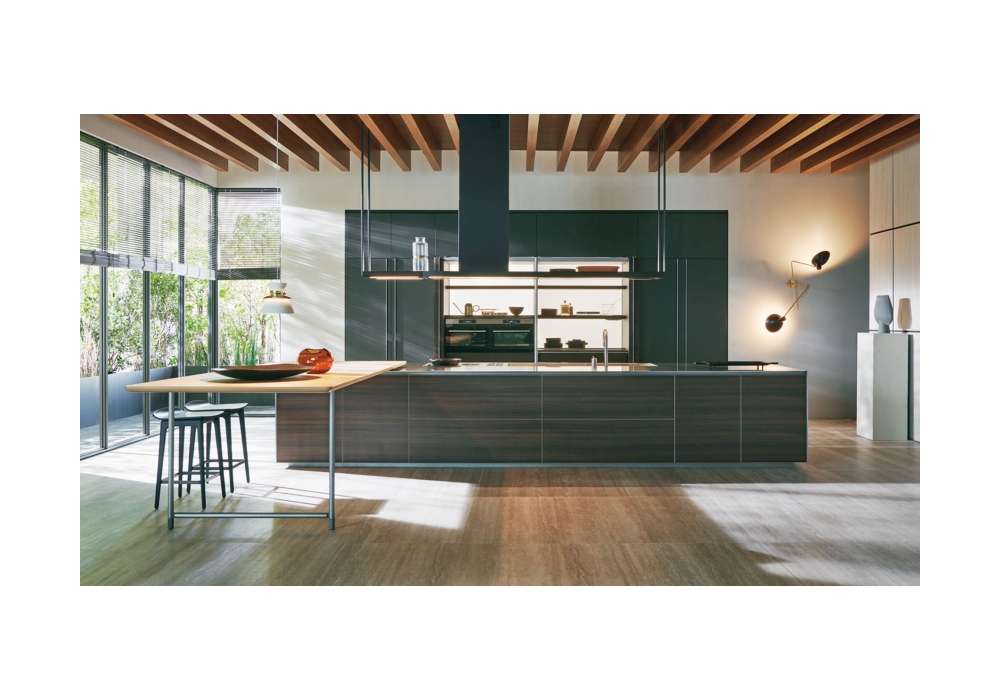 Hi-Line 6 Frame Door firmata da Molteni&C è una cucina semplice, lineare che si impreziosisce con la nuova anta Frame Door. Telaio in alluminio titan e peltro, con una selezione di finiture pregiate per le facciate. La parte superiore dell’anta è sagomata per rendere ergonomica l’impugnatura. La composizione si completa con il nuovo sistema di mensole con cappa integrata VVD e con il nuovo snack Hi-Line6, con top in massello di rovere chiaro e rovere nero, dagli spigoli e profili smussati, su struttura in alluminio titan e peltro. Materiali pregiati come eucalipto per le basi dell’isola e acciaio per il top con lavello e piano cottura integrati.