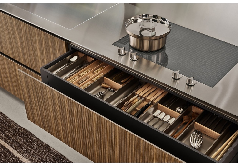 Sign 01 firmata da Ernestomeda è una cucina composta da un'isola operativa con tavolo integrato, piano di lavoro in acciaio satinato, sistema Bridge con tutti gli accessori indispensabili e colonne a giorno Daylight. Il risultato è una cucina informale, caratterizzata da una grande attenzione per i materiali, in un mix di cromatismi che creano ambienti eleganti e dal forte impatto emotivo.