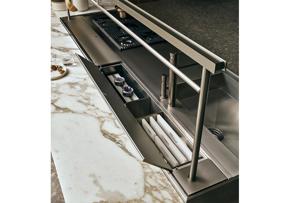K-lab 01 firmata da Ernestomeda è una cucina dal design innovativo, in cui la tradizione convive armoniosamente con la sperimentazione ed elementi “cult” sono mescolati a linee contemporanee, materiali tecnologici e soluzioni d’uso originali. Innumerevoli gli elementi che contraddistinguono K-Lab: la Vetrina Show, sospesa a parete e a terra; il tagliere Cook con invaso per l’incasso degli accessori portaoggetti; il Sistema Surf, caratterizzato da attrezzature interne modulari.