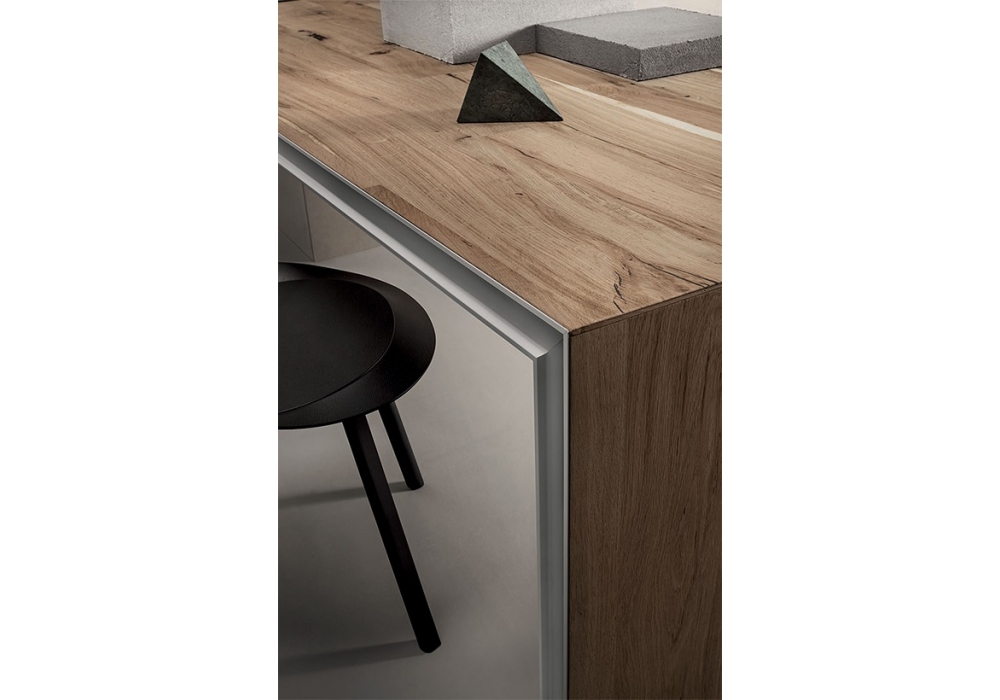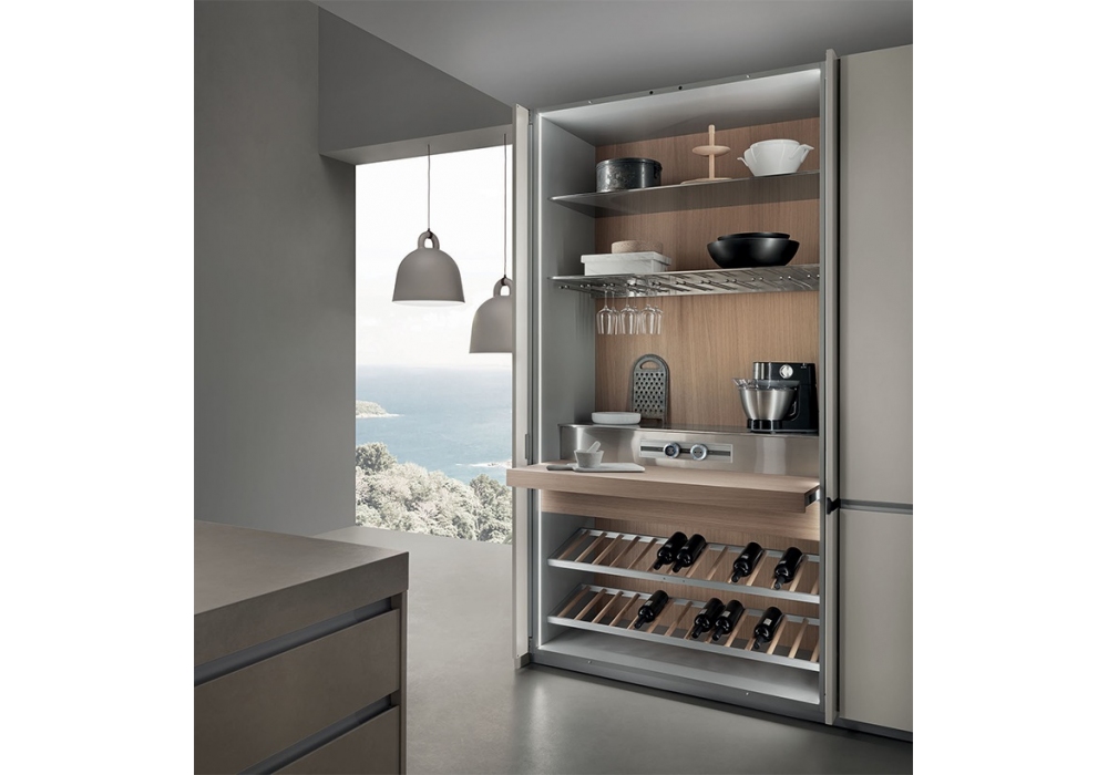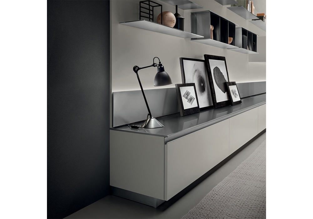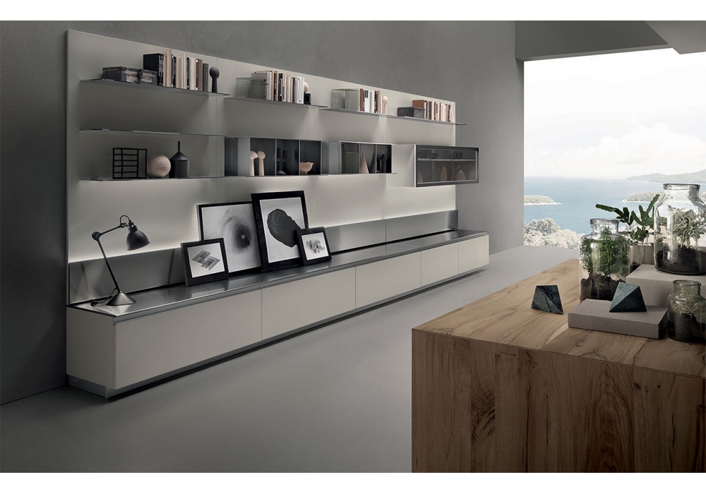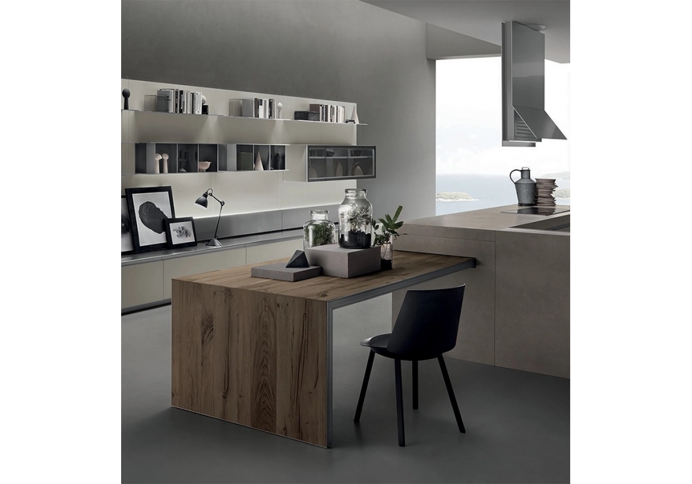 Icon 02 firmata da Ernestomeda è una cucina con penisola Evolution da poter utilizzare come zona snack in versione chiusa e tavolo da pranzo in versione aperta, piano Union con vasca integrata, zona living “Set” composta da boiserie attrezzabili con mensole e mobili sospesi di varie dimensioni.