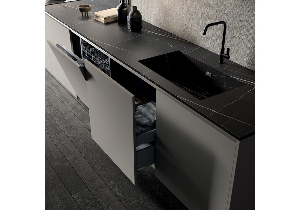 One 04 firmata da Ernestomeda è una cucina minimal e raffinata, orientata verso la massima funzionalità e volto ad appagare i sensi del tatto e della vista, grazie ai contrasti materici decisi, giochi di texture e forme nette. Una cucina lineare che, valorizzando la luce naturale e l'ampiezza degli spazi, evoca inedite suggestioni.