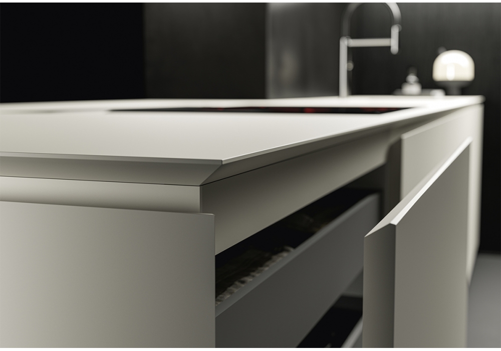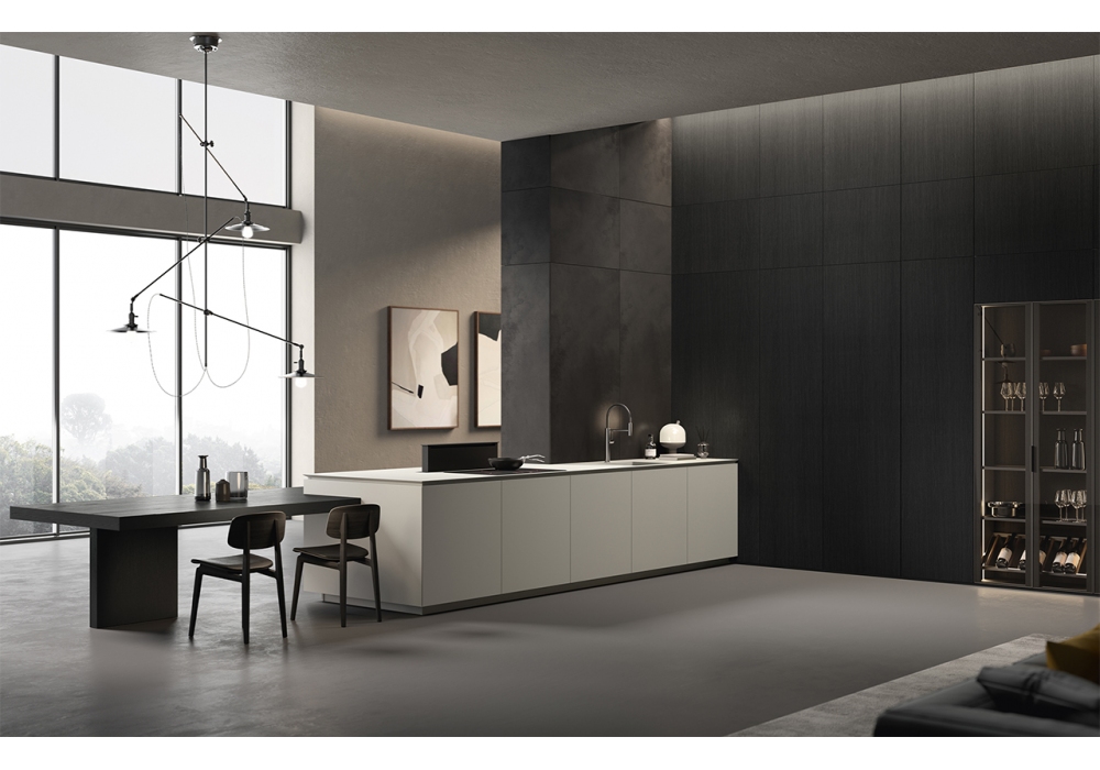 Obliqua 01 firmata da Ernestomeda è una cucina dall'immagine equilibrata e allo stesso tempo di grande carattere. Si contraddistingue per il connubio tra volumi essenziali, trame e materiali, e una cura artigianale per i dettagli. Un design lineare e rigoroso che si traduce in una continuità cromatica legata all'impiego di un'unica cromia per top, gole, ante e zoccoli. L'essenza del rovere nero a poro aperto per armadi e tavolo conferisce una nota calda e avvolgente al progetto.