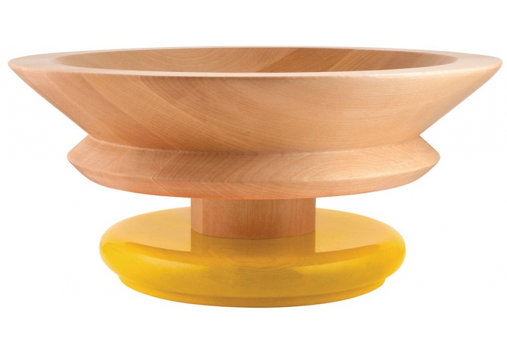 ES15 firmato da Ettore Sottsass per Alessi è un centrotavola realizzato in legno di tiglio con base disponibile in due colori: arancio e giallo.