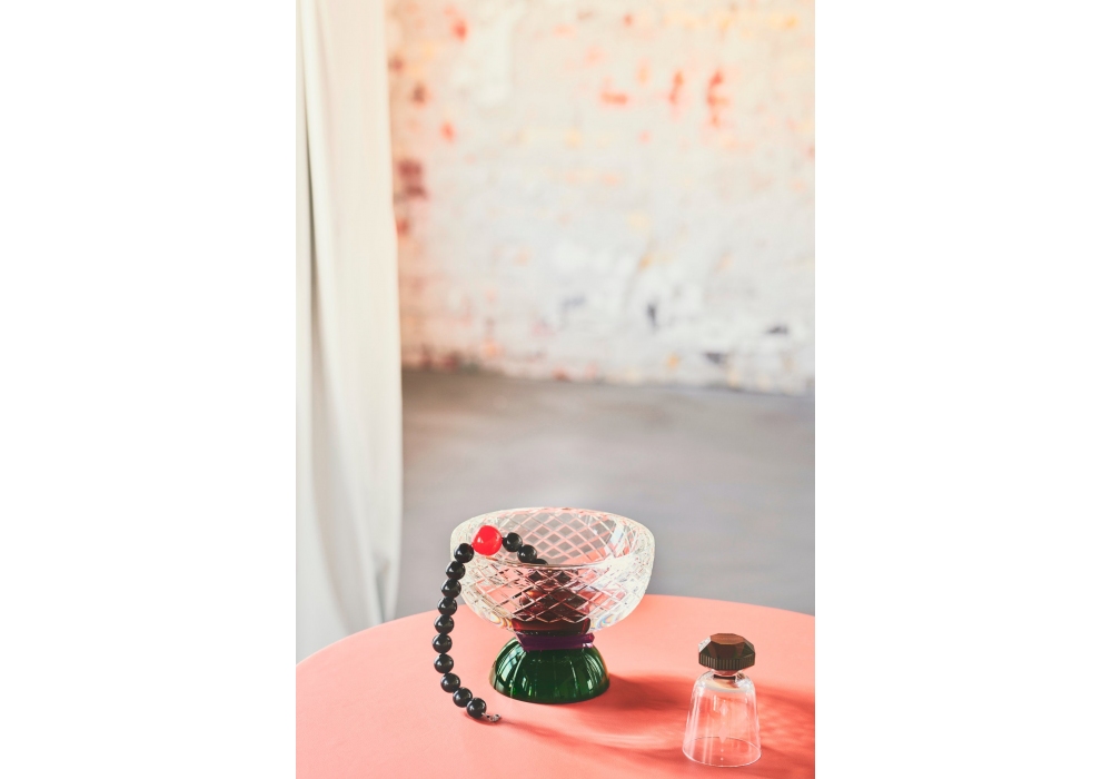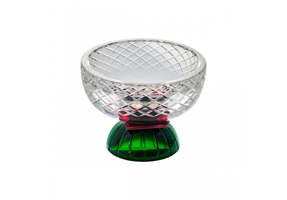 Jackie prodotto e firmato da Reflections Copenhagen è un centrotavola in cristallo con struttura a coppa intagliato e rifinito a mano nei colori verde, tasparente e borgogna.