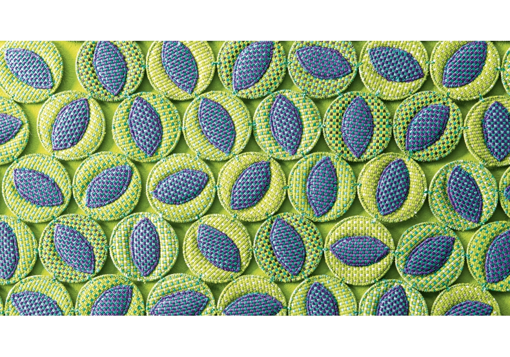 Metamorfosi Morpho firmata da Campana per Paola Lenti è una decorazione da parete realizzata dall’unione di elementi di forma tonda su cui viene cucita un’applicazione di forma ovale. Questi elementi sono composti da uno strato superiore in tessuto Brio e da uno strato inferiore in feltro sintetico, accoppiati fra loro e bordati a punto pettine. Gli elementi sono poi uniti a formare la superficie dell’arazzo, che può assumere in questo modo qualsiasi forma e dimensione. Disponibile in diverse combinazioni di colore.