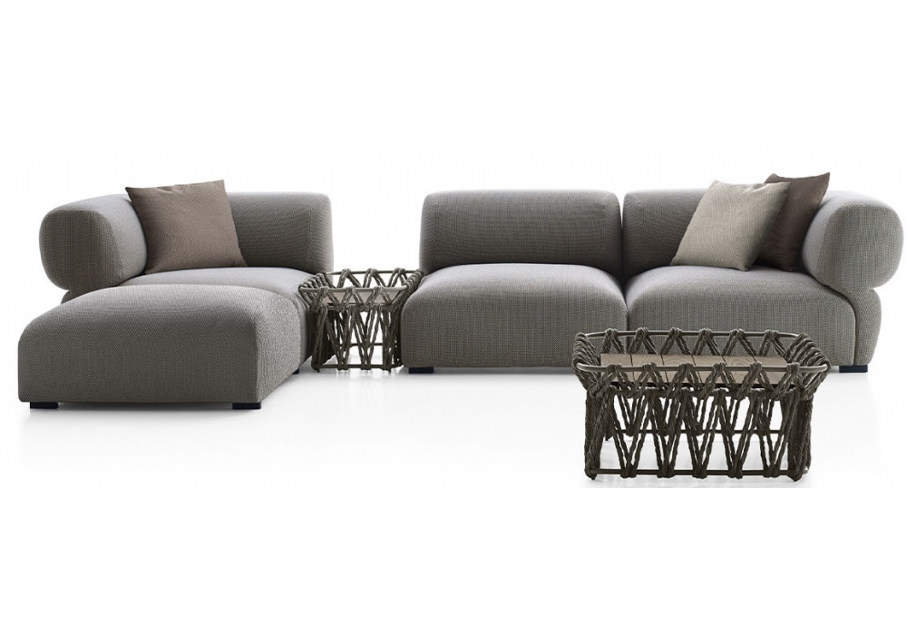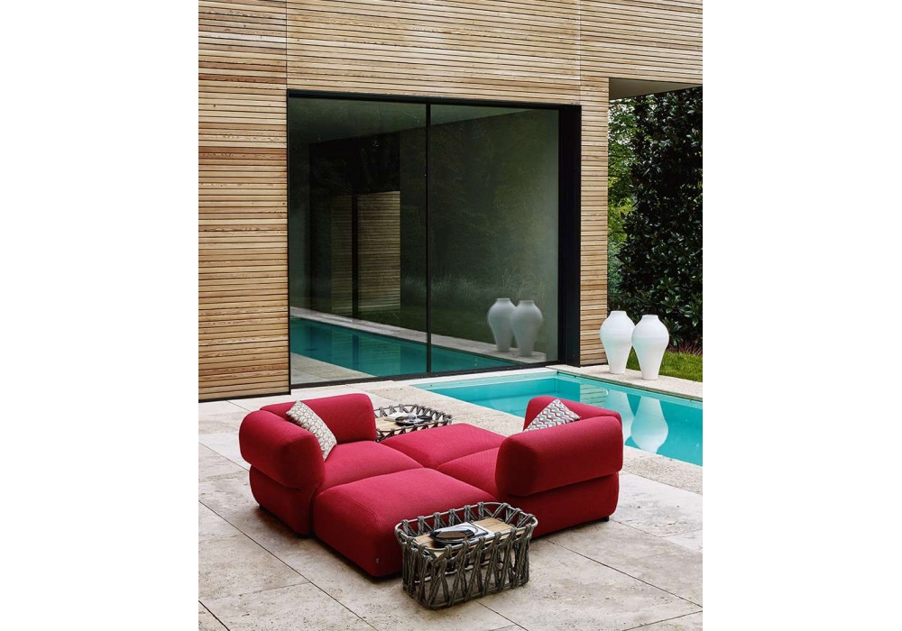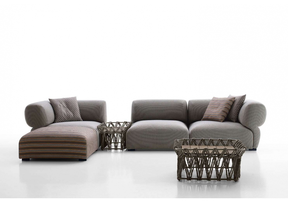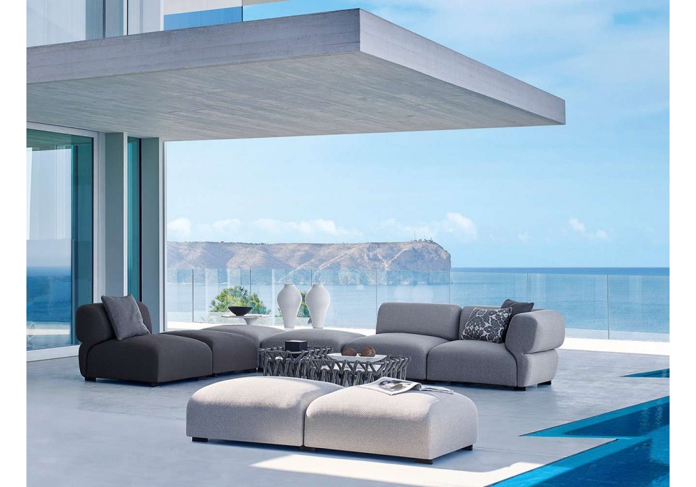 Butterfly firmato da Patricia Urquiola per B&B Italia Outdoor è un divano modulare con telaio interno in tubolari e profilati d'acciaio ed imbottitura in schima di poliuretano flessibile a freddo Bayfit®, fodera in fibra di poliestere con trattamento idrorepellente, con cuciture termosaldate. Rivestimento in tessuto in differenti finiture.