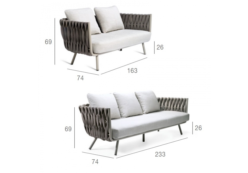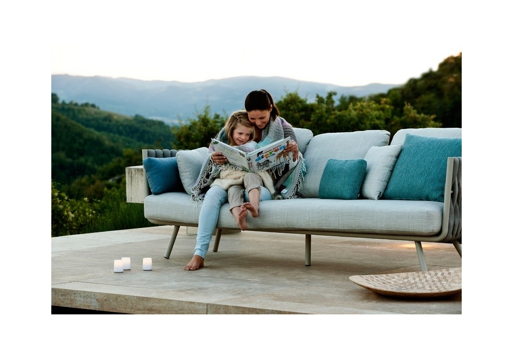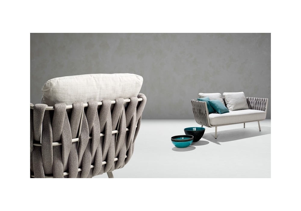 Tosca firmato da Monica Armani per Tribù è un divano con scocca in acciaio inox verniciato a polvere e rivestita con intreccio verticale extralarge, in textilene e poliolefine. I cuscini di schienale e seduta sono imbottiti e disponibili con diversi rivestimenti.