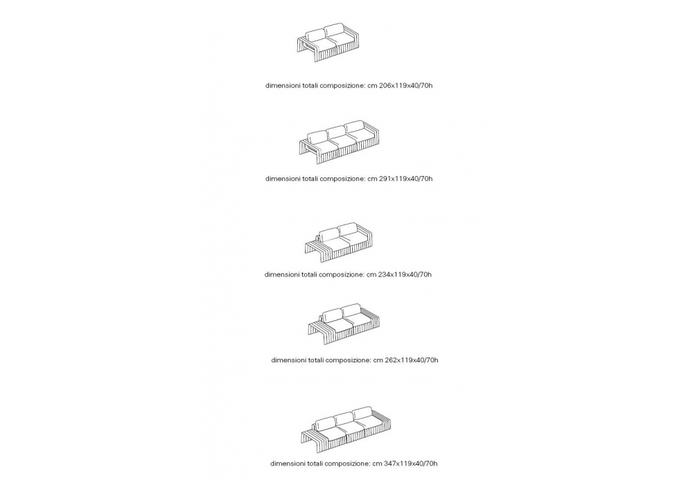 | Dimensioni | 206 x 119 x H 40/70 cm; 291 x 119 x H 40/70 cm; 234 x 119 x H 40/70 cm; 262 x 119 x H 40/70 cm; 347 x 119 x H 40/70 cm. |