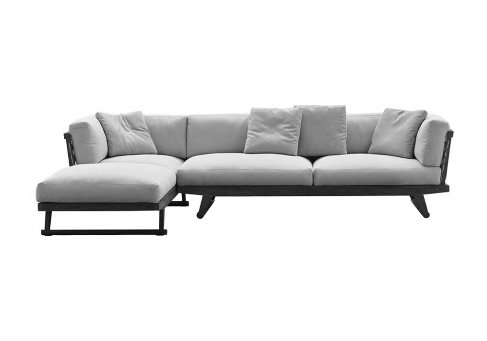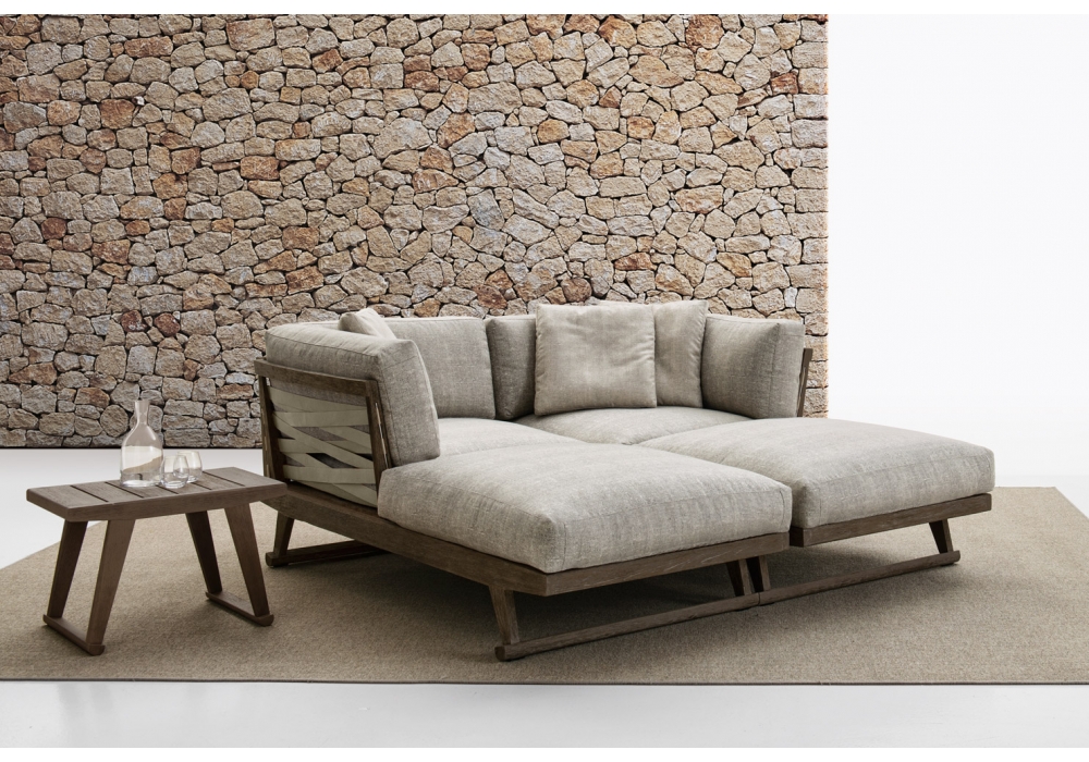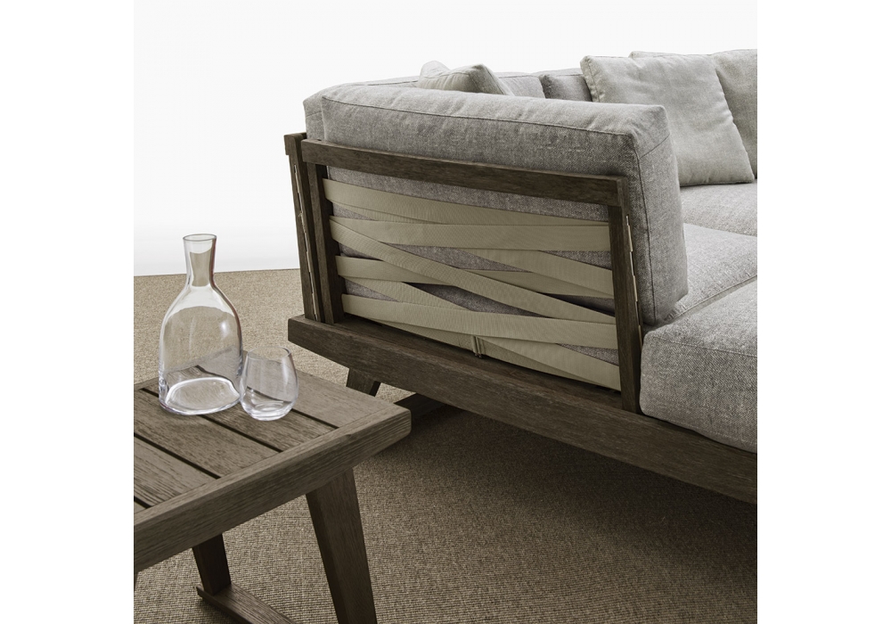 Gio firmato da Antonio Citterio per B&B Italia Outdoor è un divano per esterni con struttura in massello di teak in finitura antique grey, cingiatura in polipropilene tortora e rivestimento in differenti tessuti.
