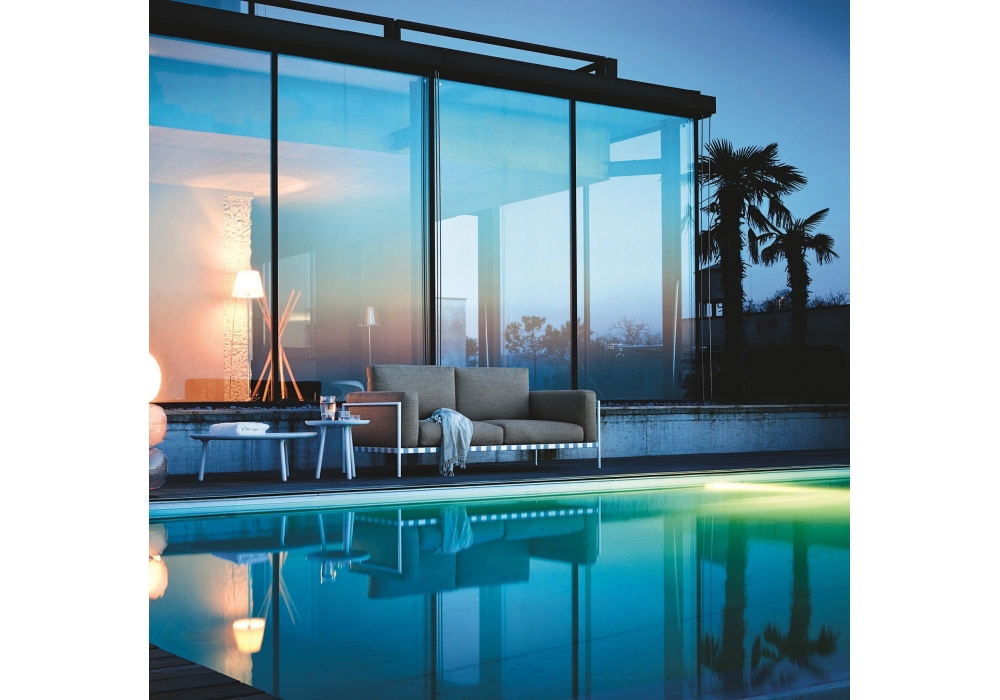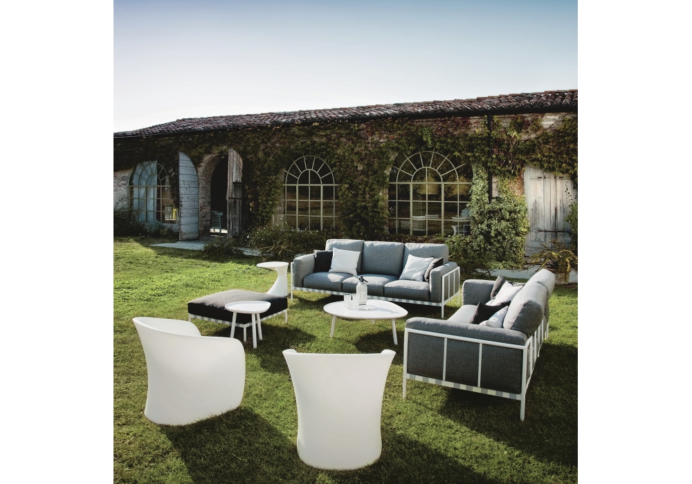 1034 Parco firmato da Emaf Progetti per Zanotta è un divano per esterni con struttura in acciaio verniciato colore bianco o nero. Tutti i cuscini sono in polietere reticolato a cellula aperta/paineira, fibra vegetale idrorepellente. Rivestimento in tessuto Talasso. Disponibile in diverse dimensioni.