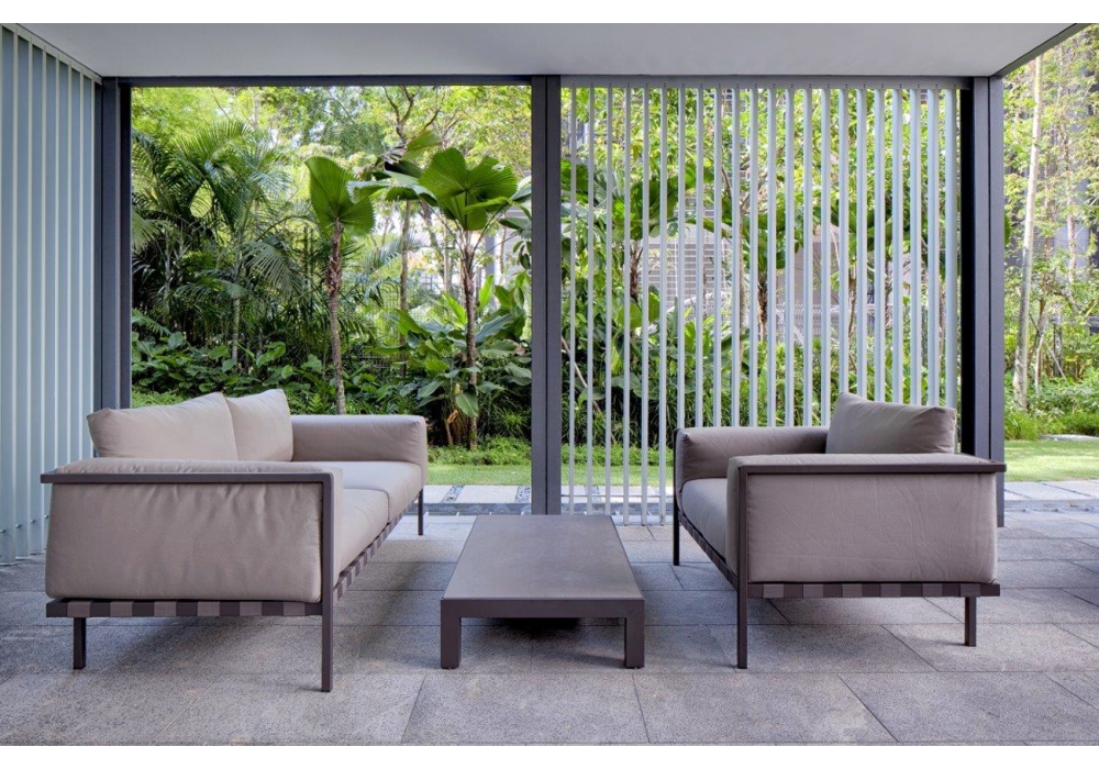 Natal Alu firmato da Studio Segers per Tribù è un divano con telaio in alluminio verniciato a polvere con una lacca resistente ai raggi UV e ai graffi, in diversi colori. I cuscini di seduta e schienale sono imbottiti e rivestiti in vari tessuti impermeabili. Disponibile in varie composizioni.
