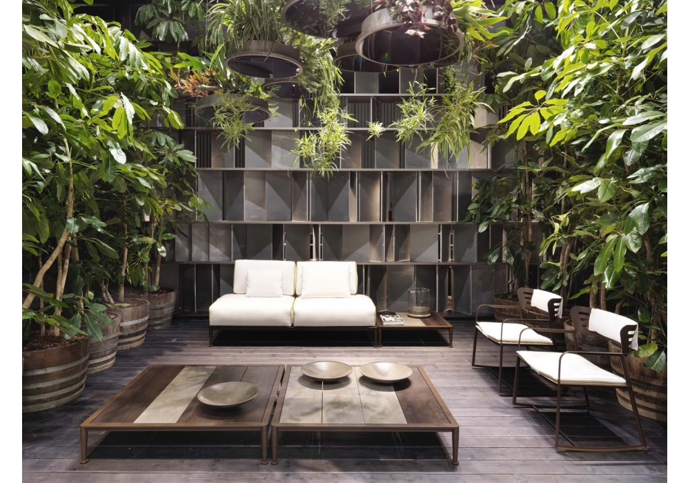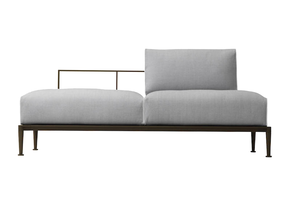 Gea firmato da Chi Wing Lo per Porada è un divano per esterni con struttura in acciaio inox protetto verniciato a polvere color carruba e seduta formata da un telaio cinghiato verniciato a polvere. Cuscini seduta e schienale in poliuretano espanso per esterno con rivestimento completamente sfoderabile. Disponibile anche con una doga posizionata a destra o a sinistra in rovere Abonos, afrormosia o marmo grigio oriente spazzolato. E’ possibile completare lo schienale con un secondo cuscino opzionale.