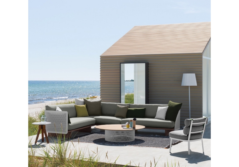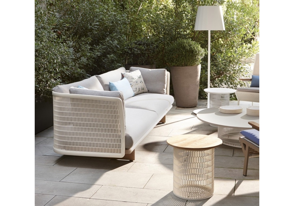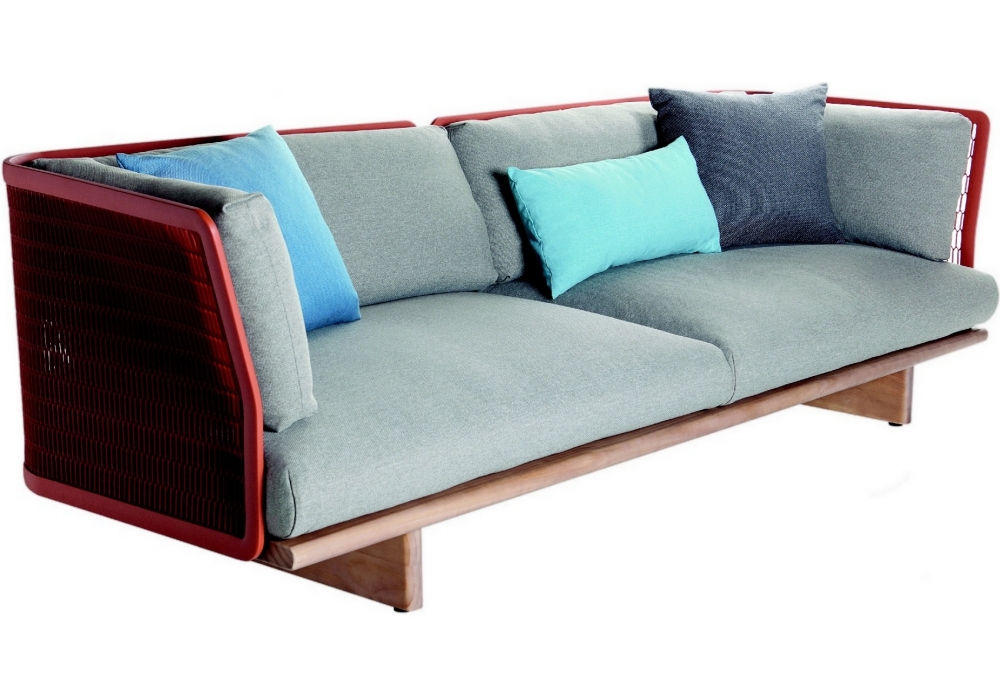 Mesh firmato da Patricia Urquiola per Kettal è un divano 3 posti per uso esterno con base realizzata in legno di teak e struttura in alluminio. La cuscinatura è imbottita con rivestimento in tessuto disponibile in differenti finiture. Su richiesta sono possibili configurazioni modulari.