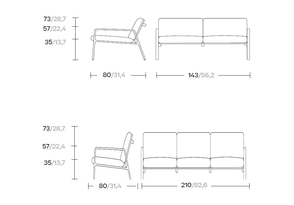 Dimensioni 143 x 80 x H 73 cm; 210 x 80 x H 73 cm.