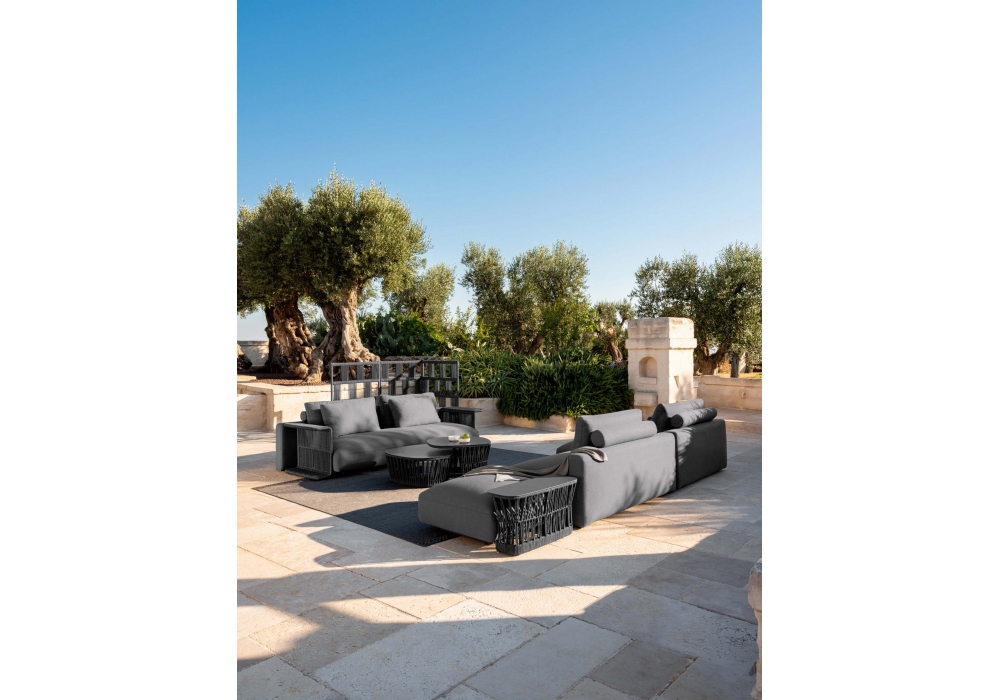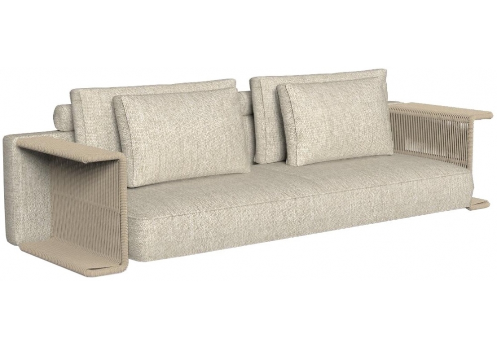 Cliff Dèco disegnato da Ludovica e Roberto Palomba per Talenti è un divano con schienale in tessuto e braccioli in alluminio rivestito in corda nautica nelle finiture della collezione Cliff.