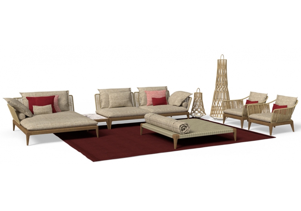 Cruise Teak disegnato da Ludovica e Roberto Palomba per Talenti è un divano modulare. Struttura in legno, schienale e braccioli in corda sintetica e cuscini impermeabili.