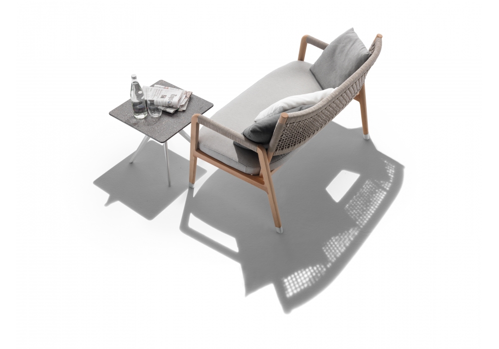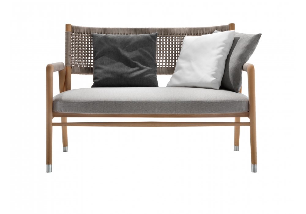 Ortigia Outdoor firmato da Antonio Citterio per Flexform è un divano della collezione Outdoor. Schienale ed inserti sui braccioli realizzati con intreccio in polipropilene. Struttura in legno massello di Iroko nella finitura naturale, tinto grigio e laccato bianco. Cuscino seduta imbottito in poliuretano espanso e rivestitimento in tessuto idrorepellente.
