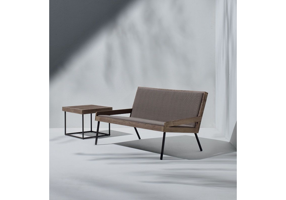 Allaperto Urban firmato da Matteo Thun, Antonio Rodriguez per Ethimo è un divano strutturato in legno teak decapato e metallo con rivestimento in tessuto di batyline color cappuccino.