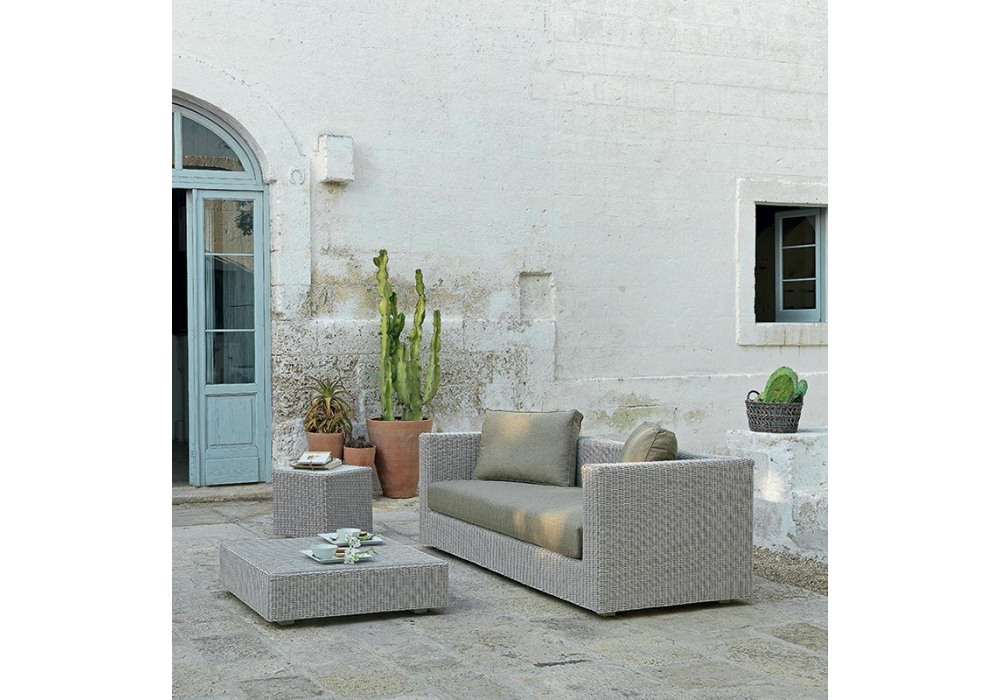 Cube prodotto e firmato da Ethimo è un divano tre posti in etwick con cuscinatura rivestita in acrilico avorio e tortora.