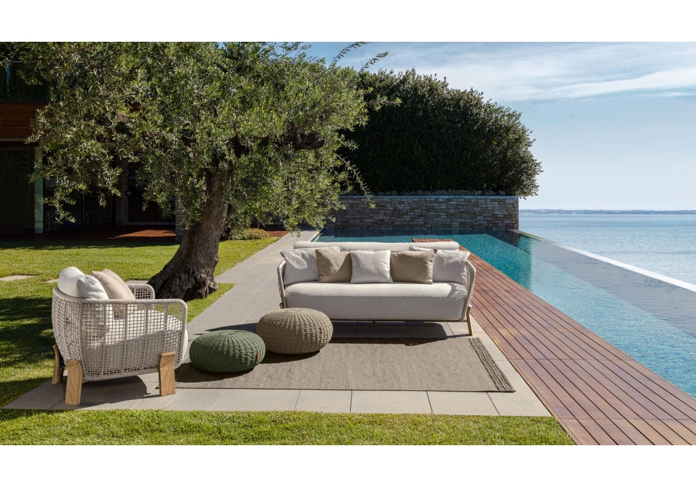 Argo Wood firmato da Ludovica + Roberto Palomba per Talenti è un divano divanetto per esterno. E' costituito da una struttura in tubolare di alluminio ricoperto da un intreccio di corde in tessuto sintetico, piedini curvi in legno di accoya disponibili nei colori palissandro o teak naturale. I cuscini sono sfoderabili e sono rivestiti con tessuti per esterni resistenti agli agenti atmosferici.