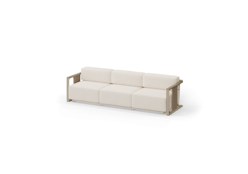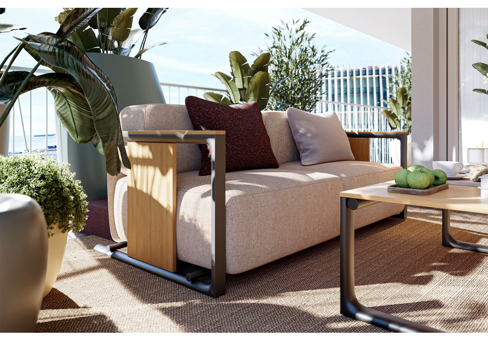 Tulum firmato da Eugeni Quitllet per Vondom è un divano realizzato con struttura in metallo e dettagli in legno di teak. Rivestimento in tessuto. Adatto sia per uso interno ed esterno, altamente resistente alle diverse condizioni atmosferiche.