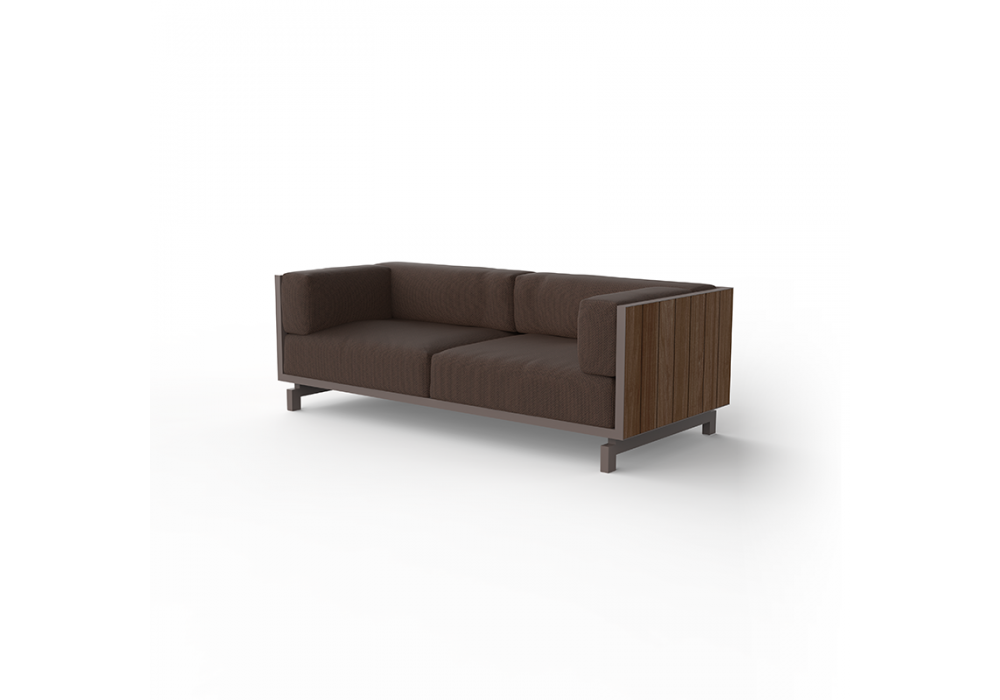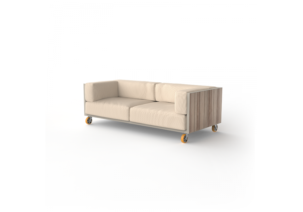 Vineyard firmato da Ramón Esteve per Vondom è un divano realizzato con struttura in alluminio, pannelli in legno e cuscini imbottiti con rivestimento in tessuto. Disponibile con ruote o con gambe.