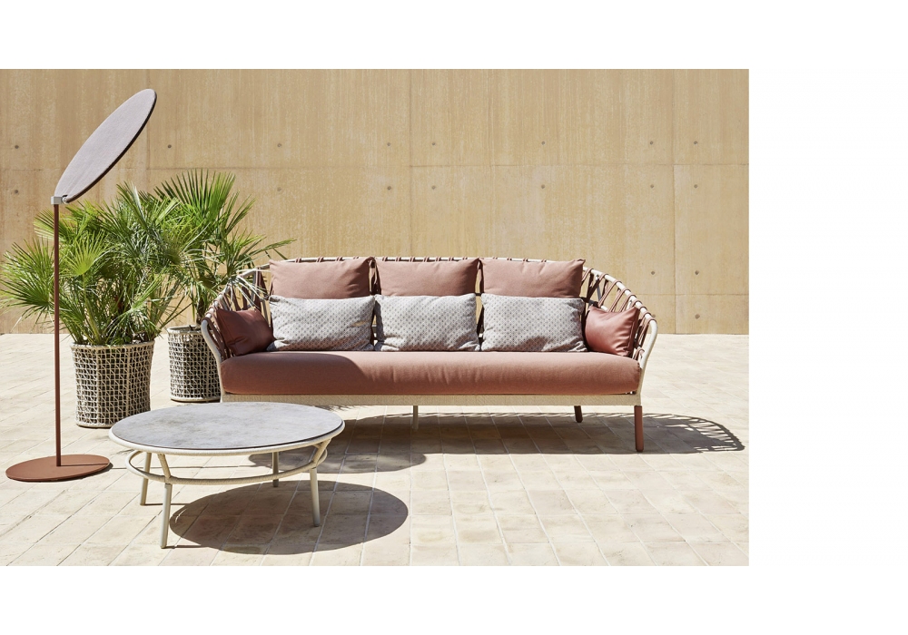 Emma Cross firmato da Monica Armani per Varaschin è un divano con base in alluminio verniciato a polveri. Struttura di alluminio verniciato a polveri a intrecciato con Band in tessuto acrilico. Tappezzeria della seduta in tessuto e imbottitura con gomme Dryfeel da esterno. Disponibile in differenti finiture.