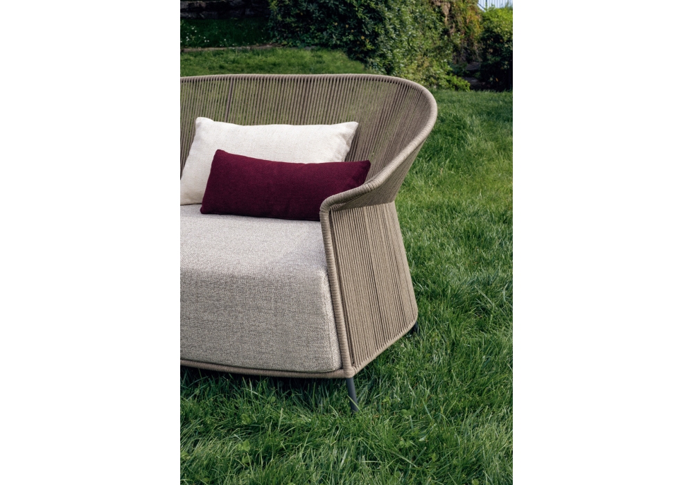 Ola firmato da Radice Orlandini per Potocco è un divano outdoor strutturato in metallo verniciato in differenti finiture. Seduta e schienale sono rivestiti con un intreccio in corda Fly da 8 mm. Rivestimento cuscinatura in differenti tessuti.