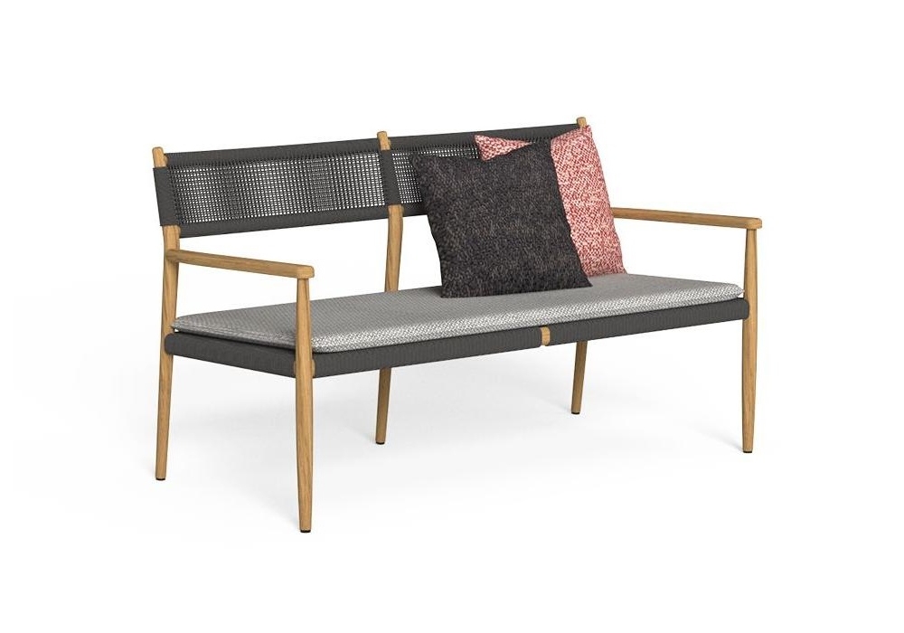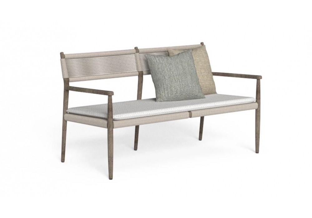 Dolcevita firmato da Talenti è un divanetto con struttura in legno, schienale in corde sintetiche imbottite, seduta e cuscino rivestiti in tessuto. Disponibile in diverse finiture.