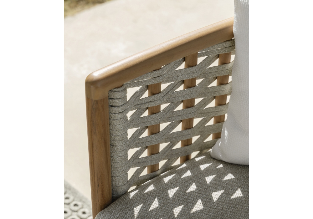 Prichi firmato da Talenti è un divano realizzato in legno, laterali con intreccio di corda sintetica, seduta e schienale imbottiti con rivestimento in tessuto.