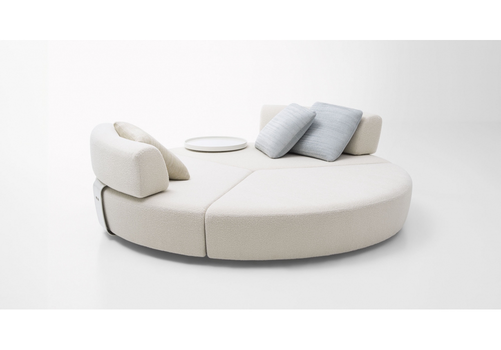 Elianto firmato da Espen Øino per Paola Lenti è un divano dalla forma circolare con struttura in tubolare e rete di acciaio inox verniciato opaco, piedini regolabili in materiale plastico. Rivestimento in tessuto sfoderabile disponibile in diverse finiture. La piattaforma è completata da due schienali e da un tavolino girevoli agganciati alla struttura.