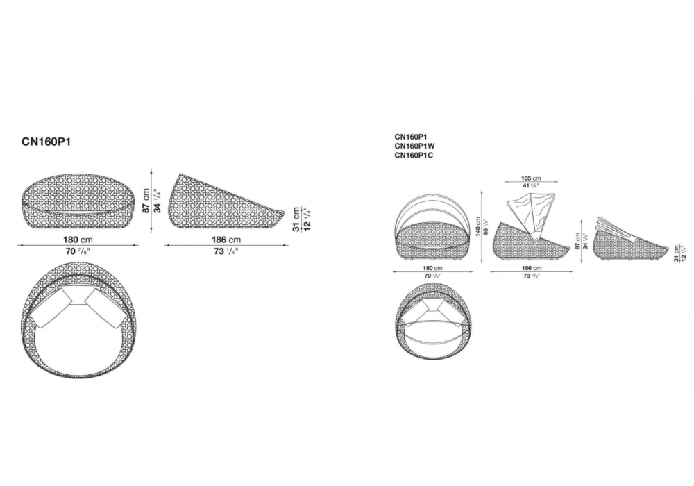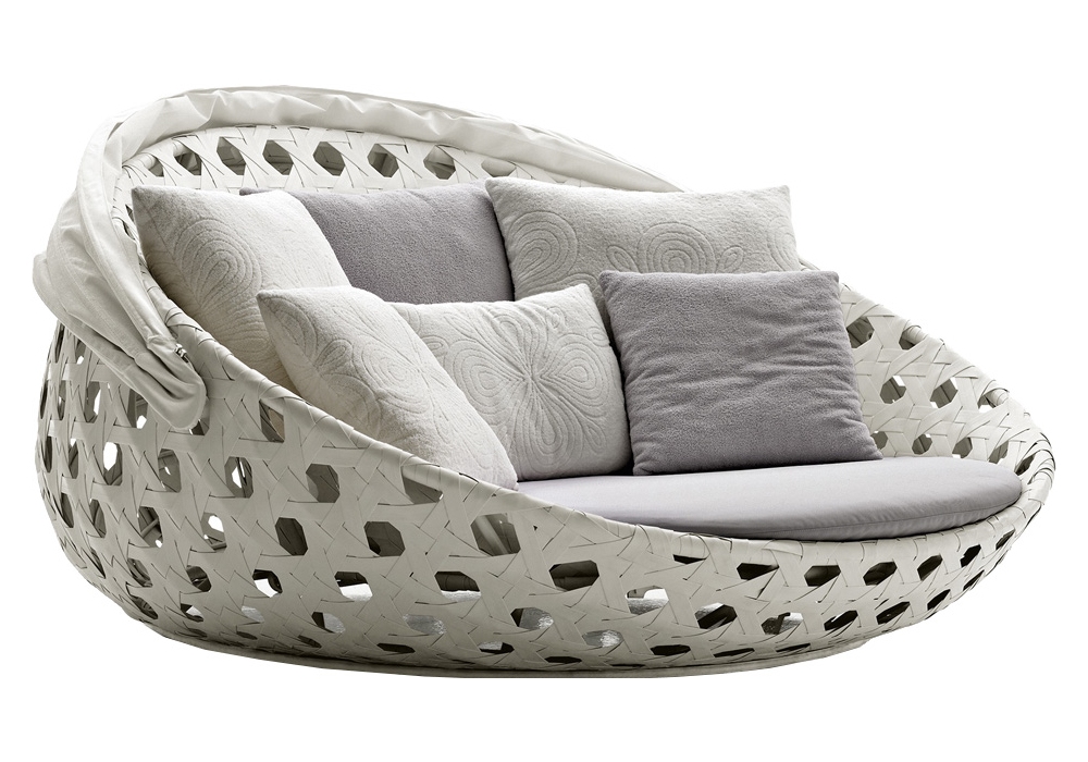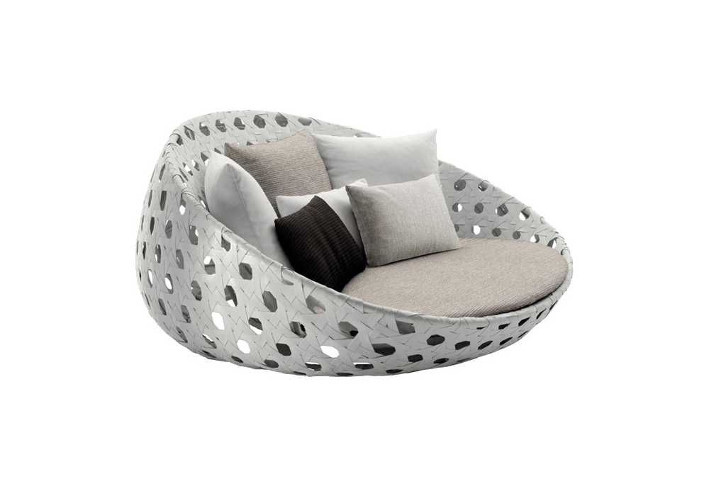 Canasta firmato da Patricia Urquiola per B&B Italia Outdoor è un divano circolare con struttura in alluminio verniciato a polvere poliestere bianco, intreccio in polietilene bianco. Cuscino sedile in poliuretano sagomato e schienale in fibra di poliestere. Rivestimento in tessuto. Disponibile con capote in vetroresina verniciata e rivestita in tessuto Batik bianco.