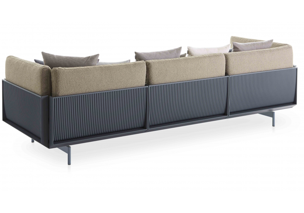 Onde firmato da Luca Nichetto per Gandia Blasco è un divano di design realizzato in alluminio verniciato a polvere con lamiera ondulata in alluminio verniciato a polvere. Seduta e schienale in gomma poliuretanica riutilizzabile e fibra di poliestere con tessuto idrorepellente. Cuscino/guanciale in fibra di poliestere con tessuto idrorepellente. Disponibile in diverse dimensioni e finiture.