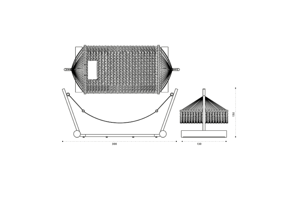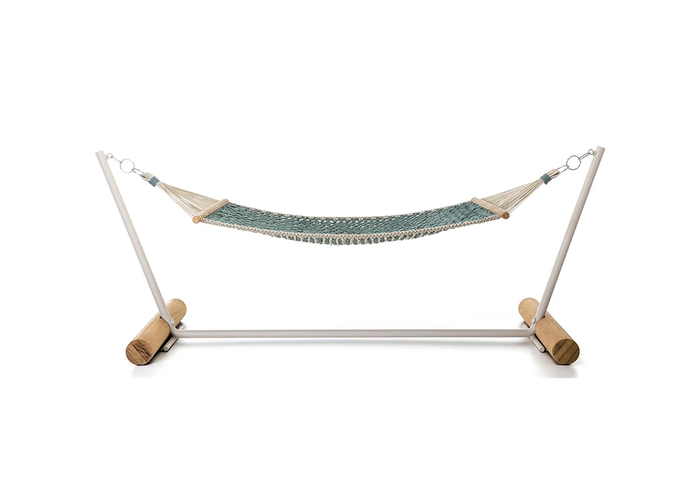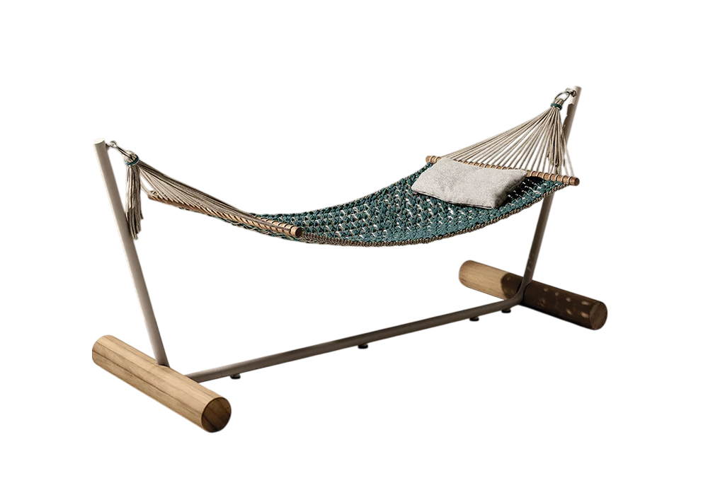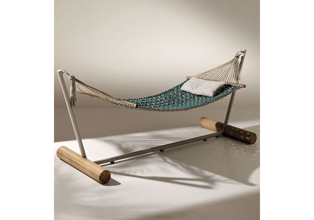 Patio firmata da Zanellato / Bortotto per Ethimo è un'amaca con struttura autoportante con base in Teak naturale e metallo texturizzato in finitura Limestone white. Amaca in corda piatta Laguna e light grey.
