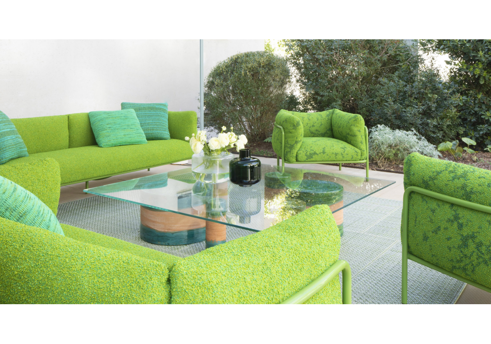 Pli firmato da Bertrand Lejoly per Paola Lenti è un divano a due o tre posti con struttura in acciaio inox verniciato opaco o lucido. Rivestimento sfoderabile in differenti tessuti.