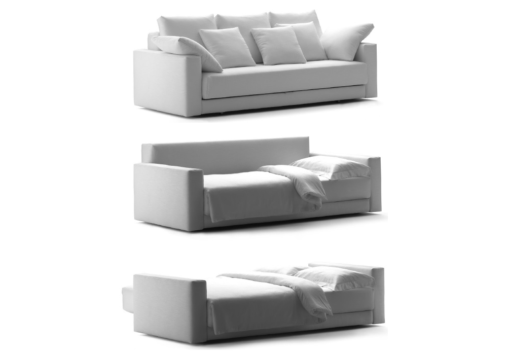 PiazzaDuomo firmato da Giulio Manzoni per Flou è una perfetta sintesi tra divano e letto; PiazzaDuomo offre soluzioni flessibili per risolvere problemi di spazio all'insegna di un codice di eleganza contemporanea. Un nuovo concept dell'abitare che svela quanto sia agevole convertire il salotto in camera da letto non con il classico trasformabile ma con un divano che con pochi gesti diventa un letto singolo o matrimoniale e, in modo altrettanto semplice, ritorna alla posizione originaria. La seduta è arricchita da tre cuscini rivestiti come il divano in tessuto o pelle sfoderabile grazie a cerniere.