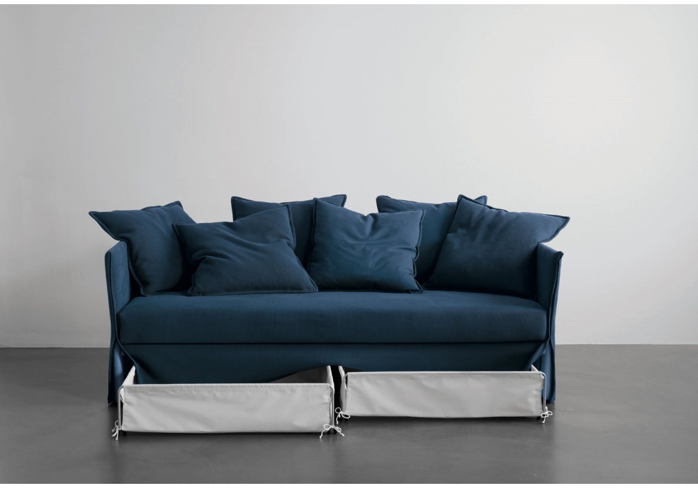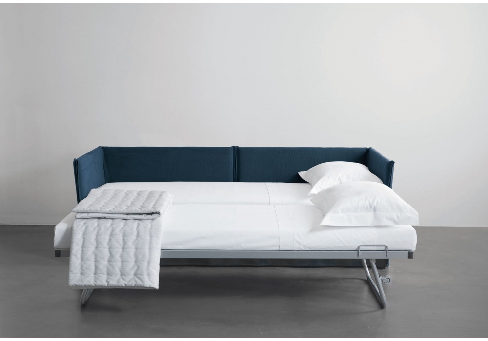 Fox firmato da Andrea Parisio per Meridiani è un twin bed imbottito con struttura in metallo con rete portante a doghe e pannelli in legno imbottiti in poliuretano. Rivestimento disponibile in tessuto. Sedile-materasso sfoderabile in poliuretano e fibra anallergica.